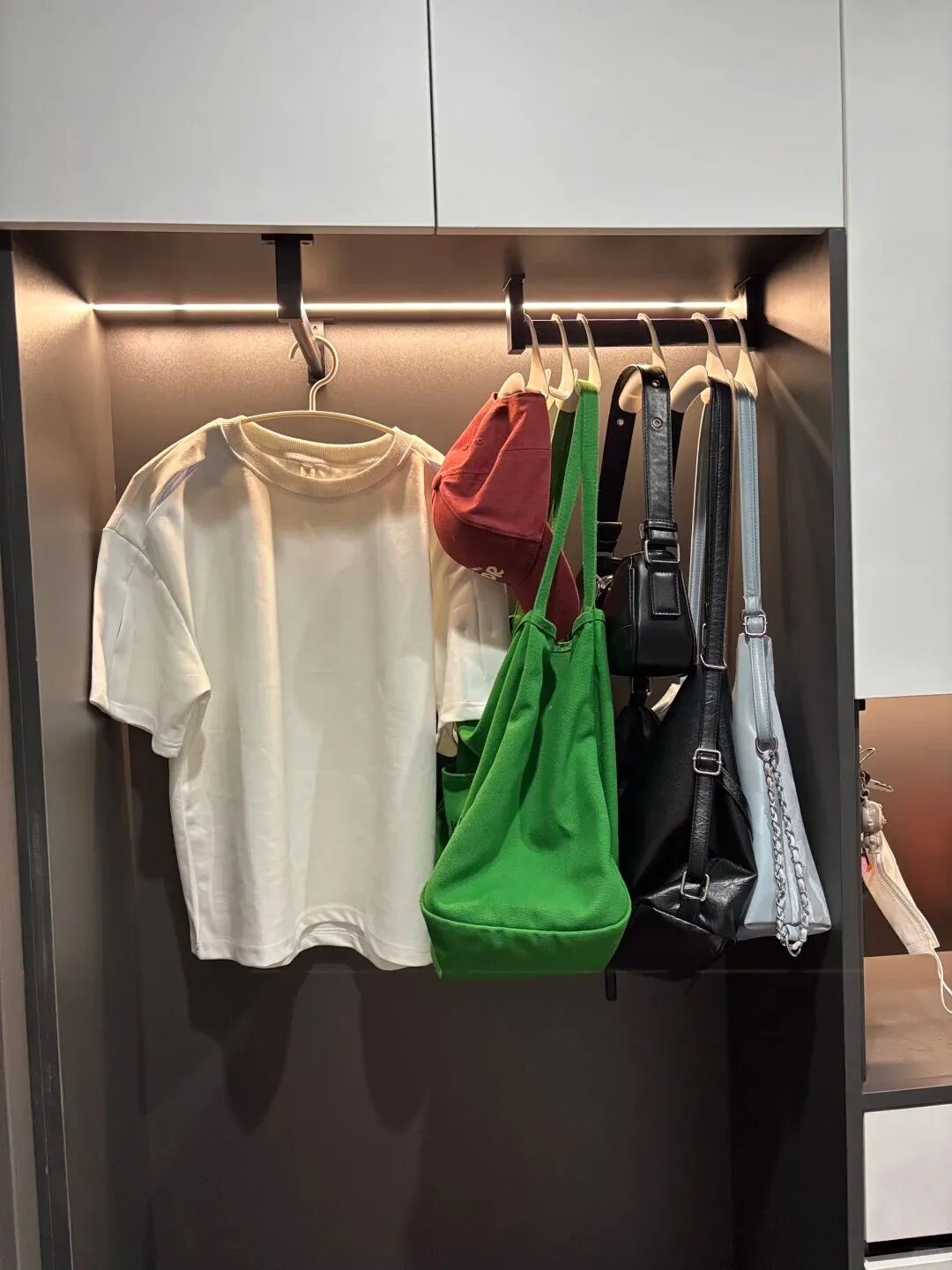我家玄关柜留了挂衣区,下班回家外套、围巾、包包一挂,不用再把衣服带进客厅卧室,玄关也能整整齐齐,出门找衣服一眼就能看到,很方便。