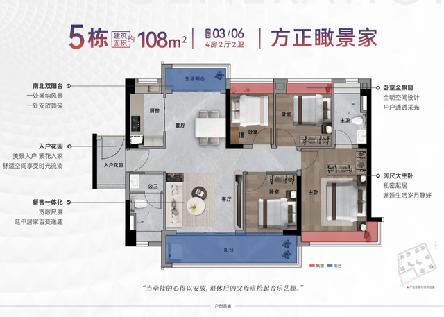 南北双阳台,盛纳风景,布局宽阔。餐客厅一体化设计,空间感显著提升,居家百变趣味。卧室全飘窗,明亮采光通透;主卧大尺度,私密起居。适合多孩或三代同堂型家庭,兼顾陪伴、成长与舒适。
