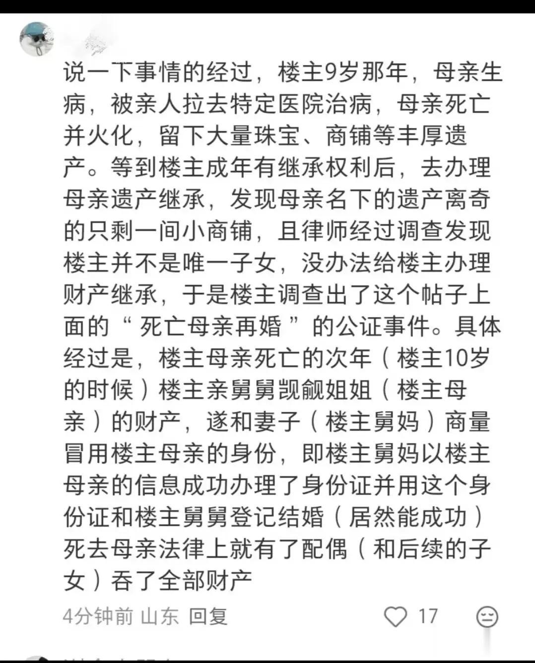 更加炸裂的是,亡母结婚的对象不是别人,而是自己的亲舅舅!这已经超出了道德伦理的底线了,如果不是因为查出自己不是唯一继承人女子可能到现在还蒙在鼓里。