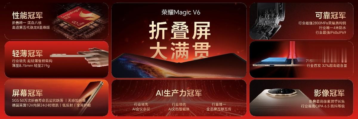 凭借荣耀在折叠屏上的突破性技术创新,荣耀Magic V6实现了屏幕、可靠、轻薄、续航、性能、影像、AI生产力七大维度夺冠,无论硬件实力还是软件体验,均实现全维度拉满,铸就折叠屏全能大满贯。