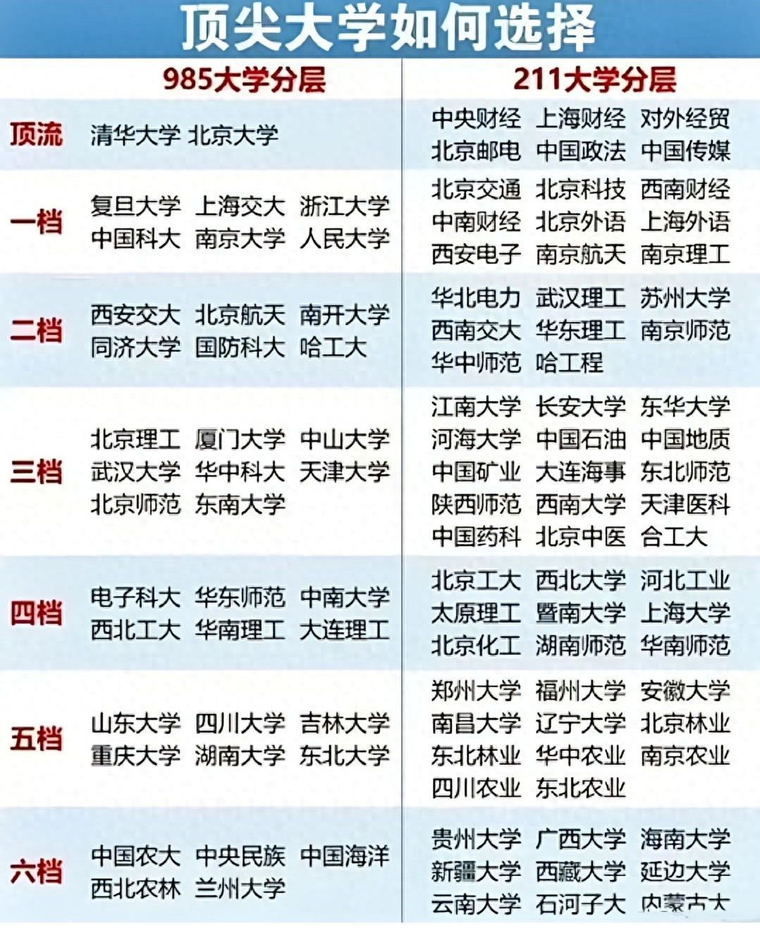 其实选大学从不是“看排名填志愿”这么简单。那张流传甚广的985/211分层表,与其说是“档次划分”,不如说是资源、地域和行业的暗码——看懂这些,才是给孩子选对路的关键。