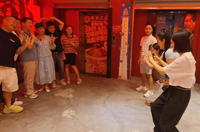 他们一帮人吃完之后,在离开餐馆之前,拍了合照纪念这次聚会,谢娜主动提出要帮亲人们拍照,她拿着手机调整拍摄角度,姿势看起来非常专业。