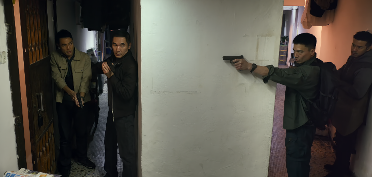 影片开场,直接将人带入到焦灼的氛围之中,在老式居民楼中,悍匪阮氏三兄弟抢劫完大楼,正准备挟持警方人质脱困,却被警方追查到了踪迹,双方玩起了“猫鼠游戏”。