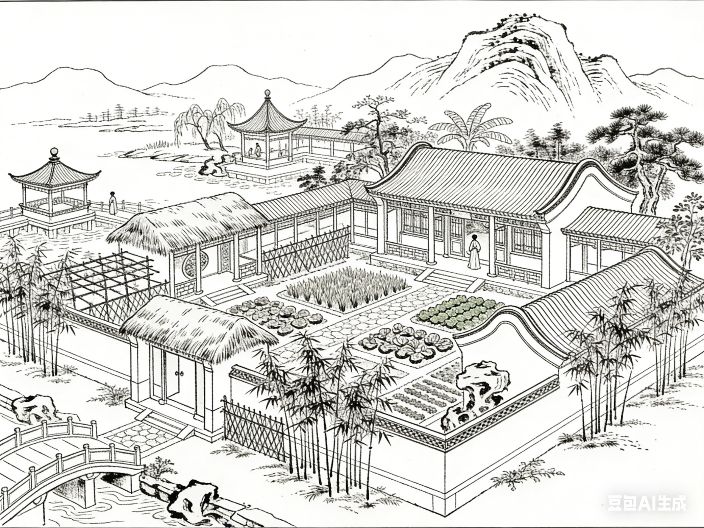 房前开辟菜园,种植各类蔬菜,绿油油的菜叶与质朴的房屋相映成趣;屋后设稻田,秋日稻穗金黄,风吹过泛起层层波浪。院内设水井,井口围青石板,尽显农家生活气息。建筑布局贴合李纨守寡后淡泊名利、潜心教子的心境,以田园景致寄托“归耕田园”的朴素追求,在繁华大观园中独辟一方清净天地。