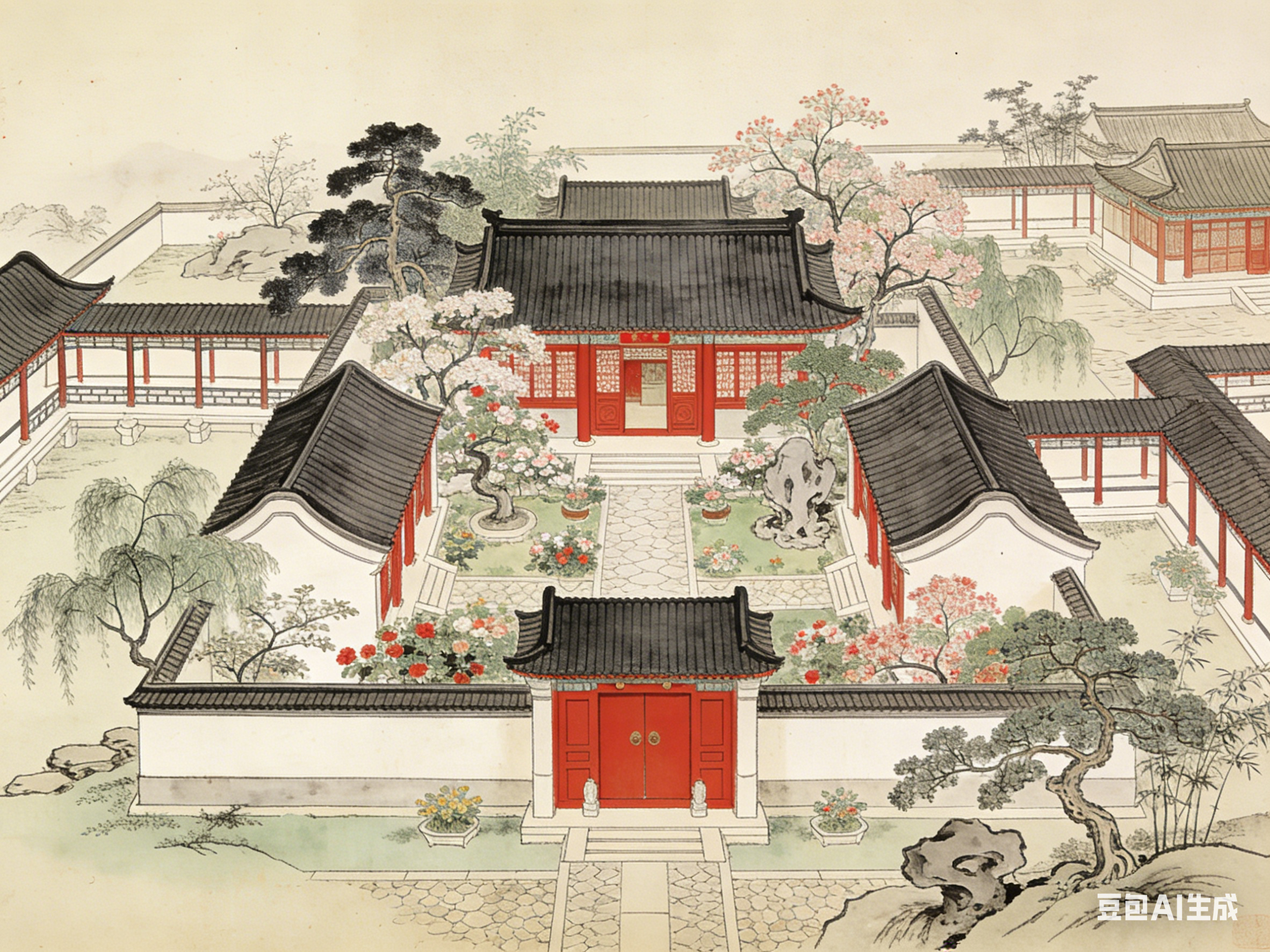 后院设花坞、池塘,池塘中种植荷花,夏日荷叶亭亭,荷花映日,为院落增添清雅之气。建筑布局灵活,游廊、厢房、花坞相互连通,形成多维度活动空间,契合宝玉热情开朗、喜爱热闹的性格。院内花木品类繁多,海棠、荷花、芭蕉错落栽种,四季景致各异,尽显“富贵闲人”的生活格调。
