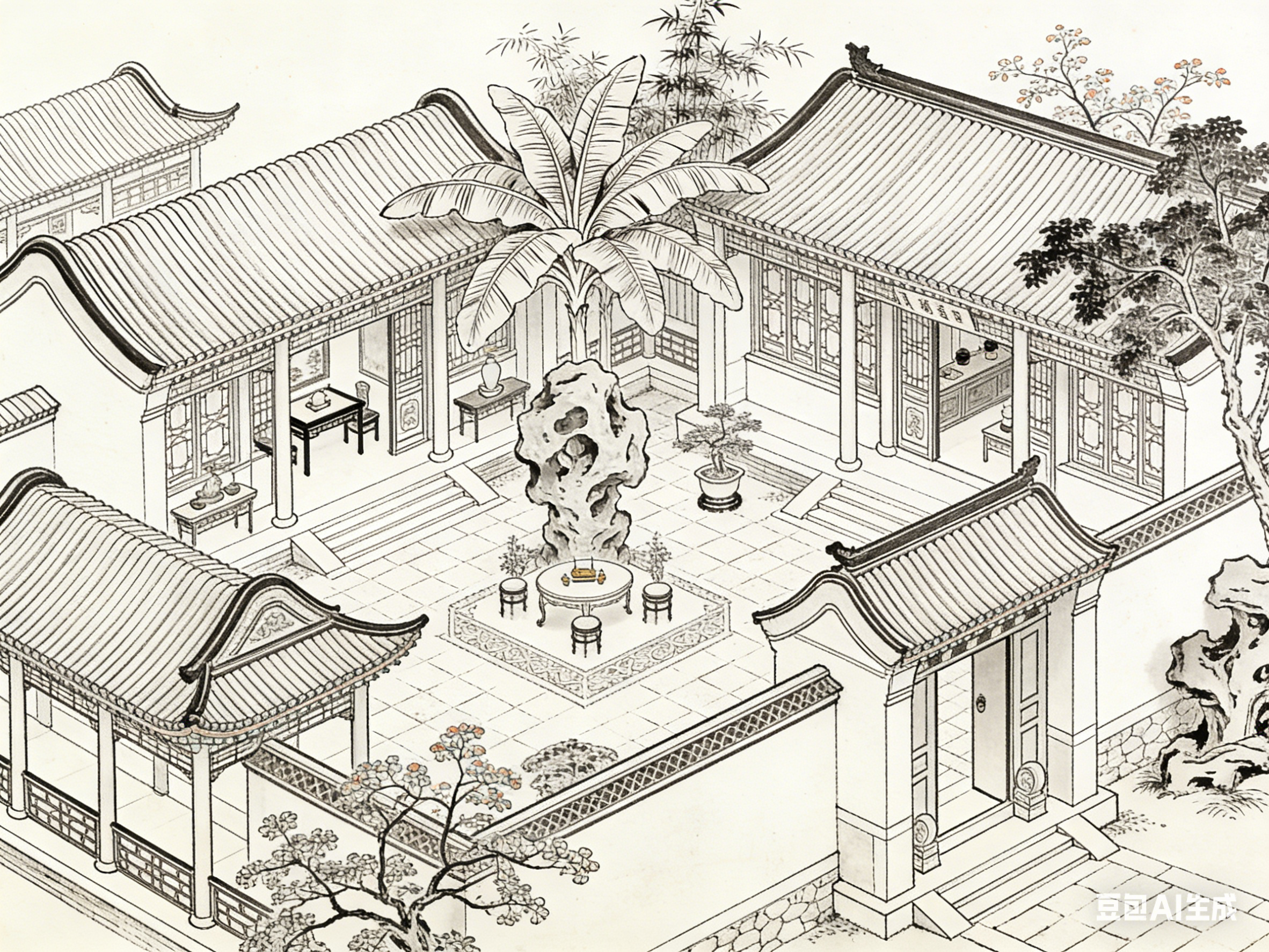 院内小径以青石板铺就,两侧香草丛生,风吹过香气弥漫。窗外植芭蕉,绿叶舒展,雨天雨点打落芭蕉叶,声韵悠扬。整体建筑无华丽装饰,以香草衬雅致,以简约显端庄,恰合宝钗“罕言寡语、人谓藏愚”的性格,藏锋芒于淡雅之中。