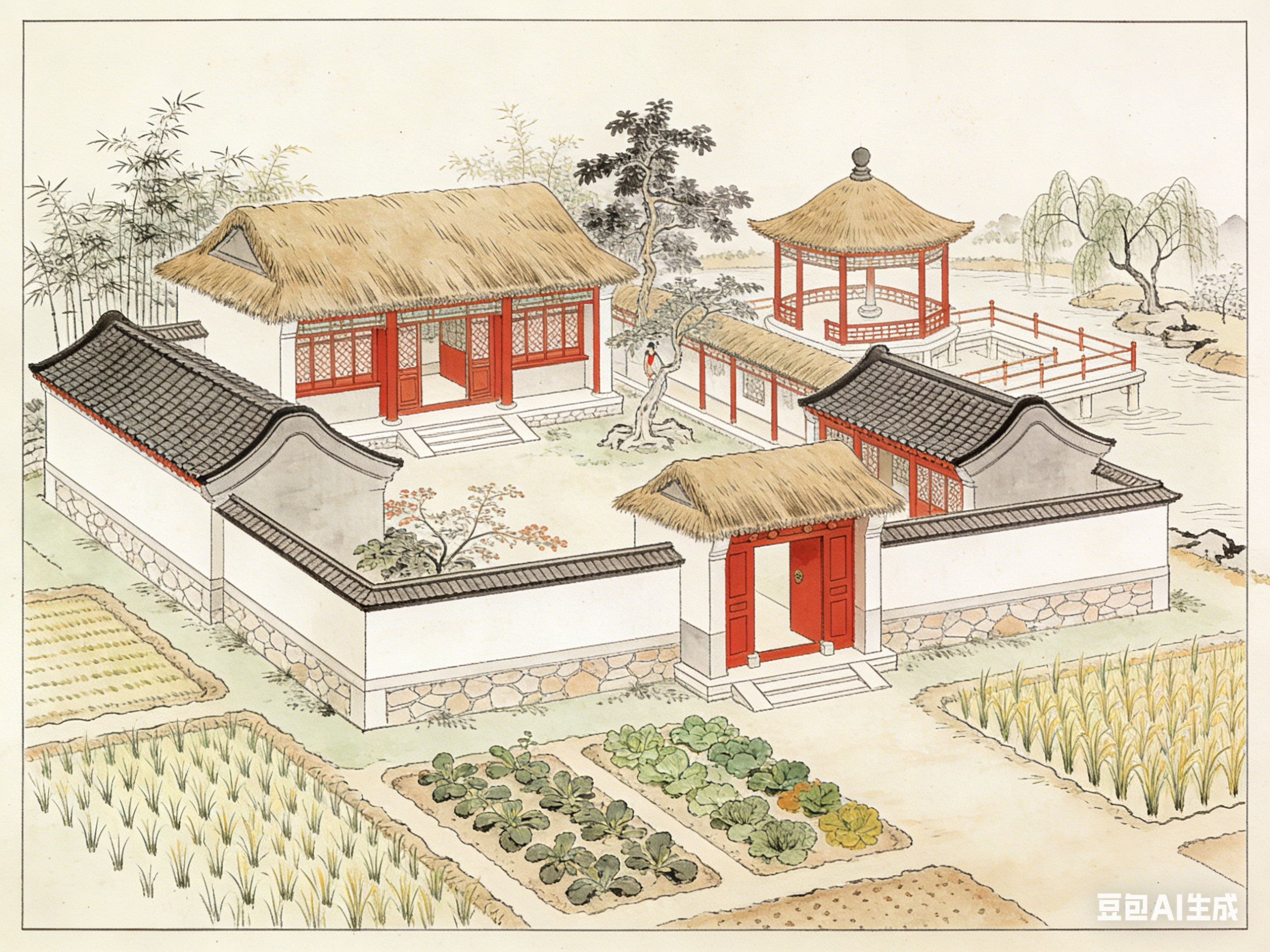 稻香村为李纨居所,建筑风格仿田园农舍,褪去贵族园林的华丽,尽显质朴自然。院门为柴门,悬挂“稻香村”匾额,两侧植老槐树,枝叶繁茂,遮天蔽日。院内无亭台楼阁,仅设几间土坯房,屋顶覆茅草,墙面爬满牵牛花,尽显田园野趣。