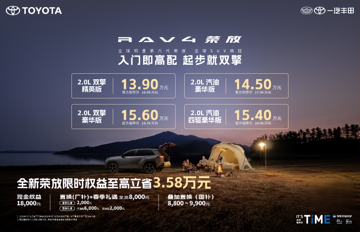 因此,智能电混双擎精英版实际价格即全新荣放起步价仅为13.9万元。入门即高配、起步就双擎、上车有TSS 4.0智行安全,且油混同强;购买全新荣放,品质口碑更可靠、长期价值更划算,买车一步到位更省心。