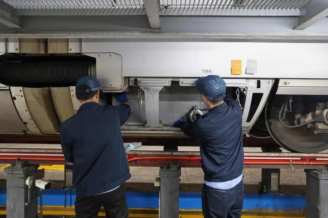当晚8点,高铁终于驶入南宁检修站。可当天的检修任务创下纪录,50组列车需要全部检修完毕才能出库,时间紧、任务重,所有人都在争分夺秒。即便如此,地勤机械师严芝科和搭档,依旧把钟女士的求助放在第一位,早早在列车旁等候就位。