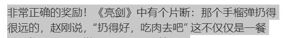 非常正确的奖励!《亮剑》中有个片段:那个手榴弹扔得很远的,赵刚说,“扔得好,吃肉去吧” 这不仅仅是一餐好的饭食,是荣誉,是努力后的结果。