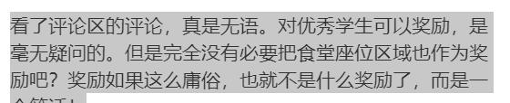 看了评论区的评论,真是无语。对优秀学生可以奖励,是毫无疑问的。但是完全没有必要把食堂座位区域也作为奖励吧?奖励如果这么庸俗,也就不是什么奖励了,而是一个笑话!