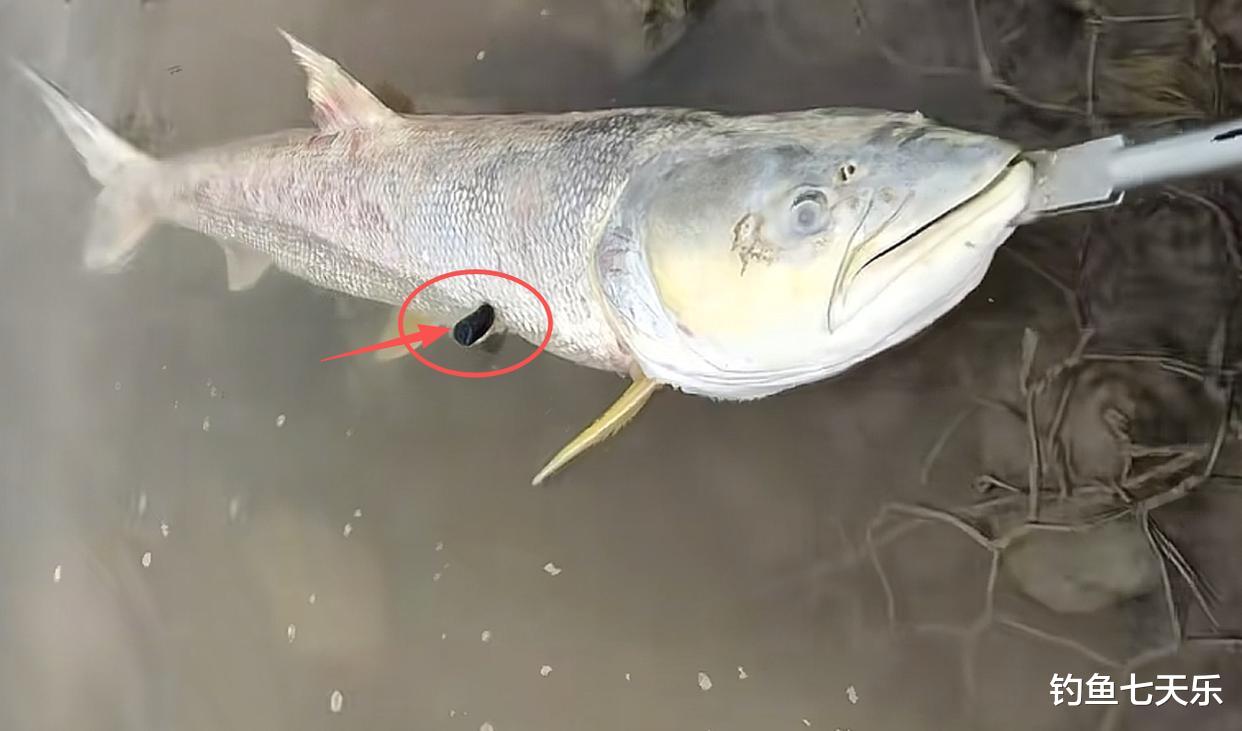 结果不出所料,在这条死鱼的腹部位置,有一个黑色的圆柱体。如果你是钓鱼爱好者,一看这个东西就明白个八九不离十了。