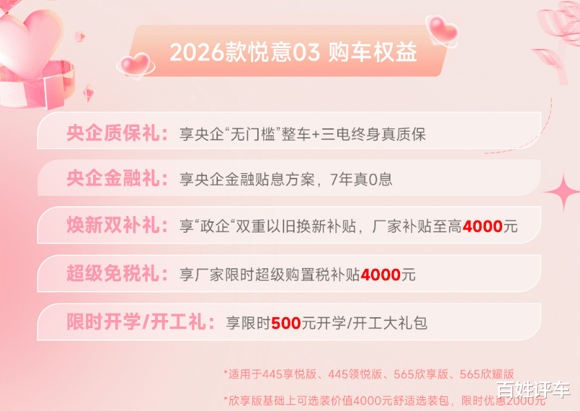 为了让更多家庭轻松拥有这份“悦意”,2026款悦意03还重磅推出央企五重礼遇。购车即享央企质保礼,“无门槛”整车及三电终身质保真诚以待,更有7年真0息央企金融礼,极大降低拥车门槛,同时,新车叠加焕新双补礼,政企双重以旧换新补贴至高4000元,以及限时4000元购置税补贴的超级免税礼、限时500元的开学/开工礼。特别值得一提的是,还有限时半价权益,可升级价值4000元的舒适选装包(具体优惠政策请详询当地经销商)。在这个女神节,让爱与梦想零负担启程。