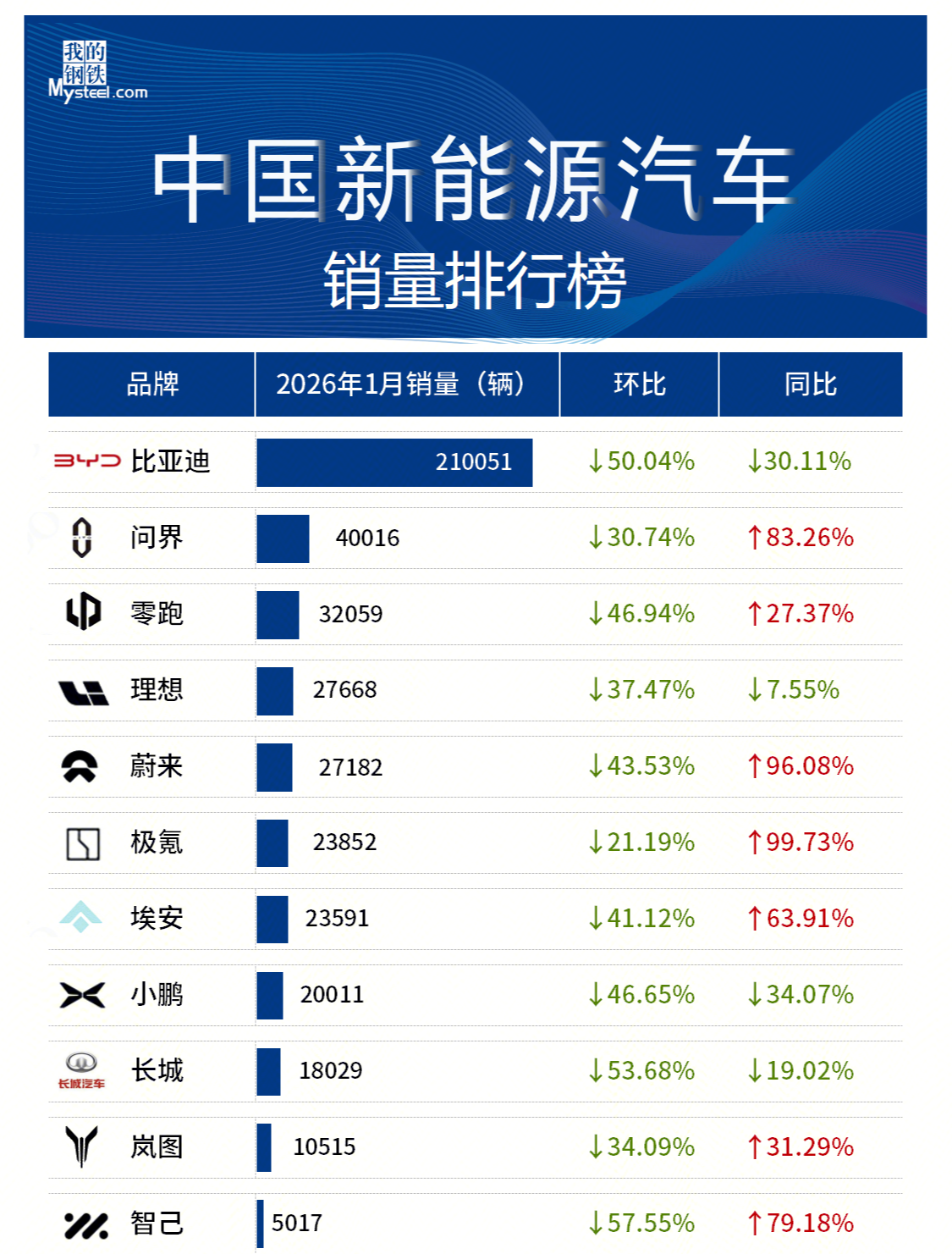 据Mysteel不完全统计,截至2026年2月3日,11家主流车企发布2026年1月新能源汽车销量数据。从环比来看,11家车企全部下降。其中,智己汽车下降57.75%,跌幅最大。从同比来看,6家车企实现增长。极氪以99.73%的增速位列第一,蔚来紧随其后,同比增长96.08%。具体情况如下: