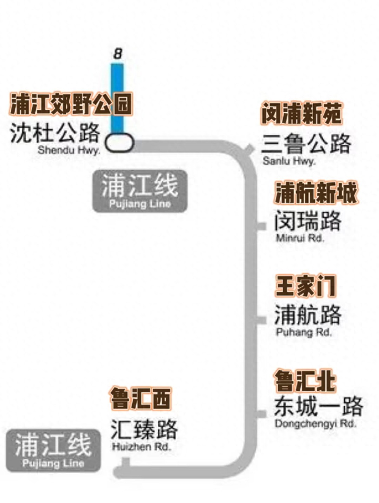 和这个线路隔一堵墙的浦江线则不同,它只有6公里的长度,在2018年通车,设置6个高架站,主要服务浦江镇等一片的居民出行。它使用的胶轮导轨系统,只有4节车厢,个头比较小,在承载量上也没有8号线好。所以简单点讲就是跟8号线不在一个体量。