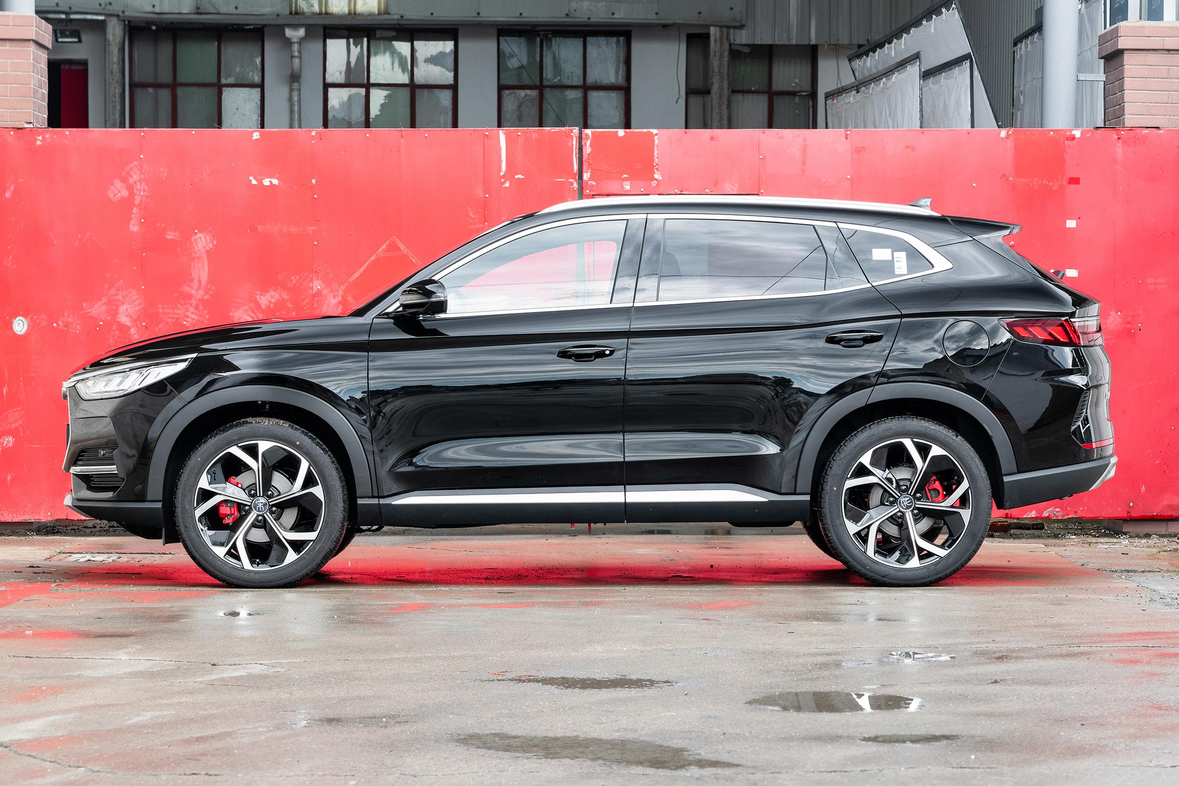 从侧身来看,整个造型设计比较运动,线条时尚简约,上方配有实用性较高的行李架,下面搭配多辐花瓣式大尺寸轮毂,气派十足,车门下方内凹型设计,增加了车辆的肌肉感,彰显着力量。