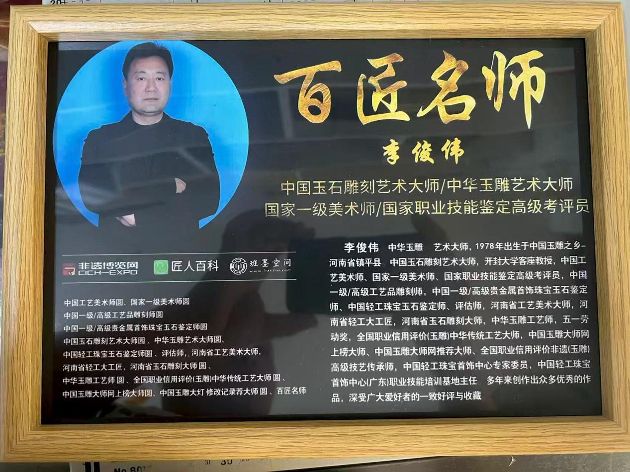 李俊伟,1978年生于“中国玉雕之乡”河南镇平,当代玉雕非遗传承人,集玉石雕刻大师、国家一级美术师、国家职业技能高级技师三重权威资质于一身,师从中国玉雕大师孟庆东,深得师门技艺精髓。