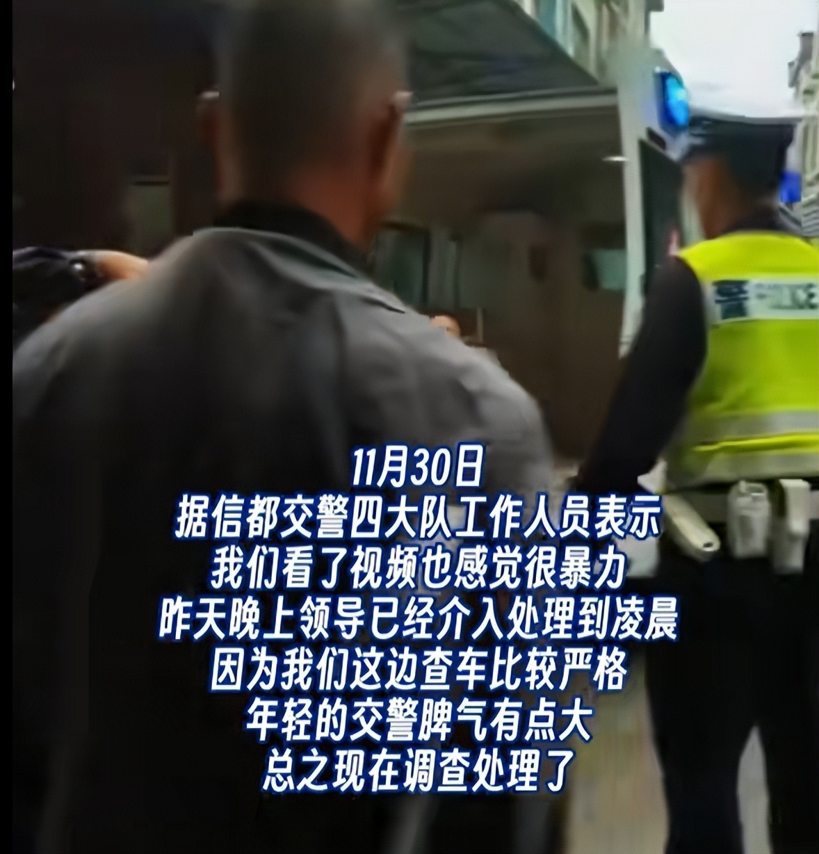 当地交警部门的工作人员称,他们看到这个视频也觉得非常暴力,并称他们在当地查车比较严格,年轻交警脾气比较暴躁,目前相关领导已经介入调查。查车严格可以理解,暴力查车本身就是不合法的行为,已经对他人生命健康构成威胁。