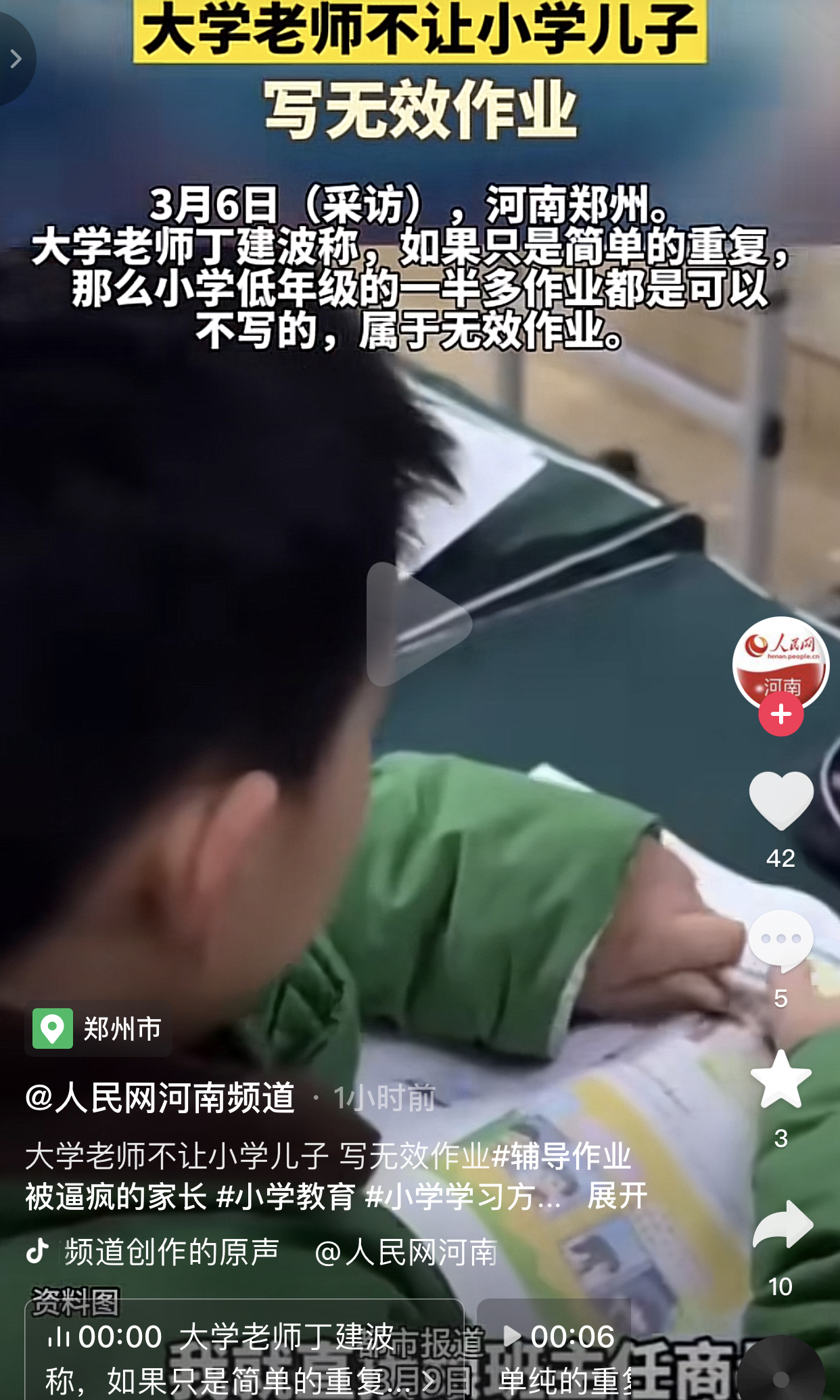 近日,河南一大学老师丁建波,他不愿意让自己上小学的儿子重复写无效作业上了热门。