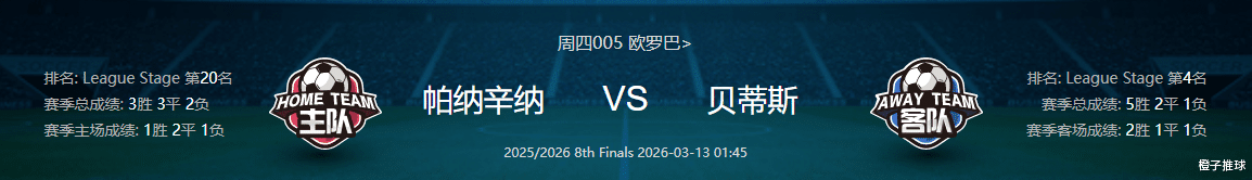 看法:帕纳辛纳科斯近期状态优异,近7场正式赛事保持不败,防守出色但进攻火力稍显不足。皇家贝蒂斯则状态低迷,近3场未尝胜绩,客场表现极不稳定,攻防两端都存在明显问题,毫无疑问贝蒂斯在客场难有太大拉力。从深层逻辑来看,贝蒂斯虽然上轮联赛败了,但是球队轮换了阵容,安东尼,福尔纳尔斯,马克罗卡,里克尔梅等关键球员都得到了休息,主教练佩莱格里尼对于杯赛比较重视,联赛轮换特意为了本场蓄力。目前数据上给贝蒂斯微微升高,把大众关注点集中到帕纳辛纳的诸多显性利好上来,对于贝蒂斯打出是好事儿,本轮个人看好客队拿下三分。