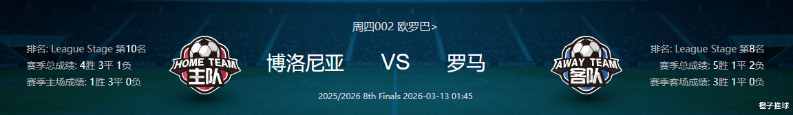 博洛尼亚的表现可圈可点,作为欧战赛场的黑马,球队展现出极强的韧性与竞争力,在本届欧联杯中稳步前行,以4胜3平1负的战绩成功晋级淘汰赛,凭借这一稳健表现,成为意甲球队在欧战赛场的有力代表。尤为关键的是,球队虽近期遭遇联赛小挫,终结连胜势头,但欧战赛场状态依旧在线,近3场欧联更是一球未丢,防线表现稳固,本轮对于球队抢占两回合晋级先机、实现欧战突破至关重要。球队攻防均衡无明显短板,10场欧联赛事轰入16粒进球,能持续给对手制造威胁;防守端场均仅丢0.7球,协防意识出色,只是主力后卫伤停带来一定隐患。