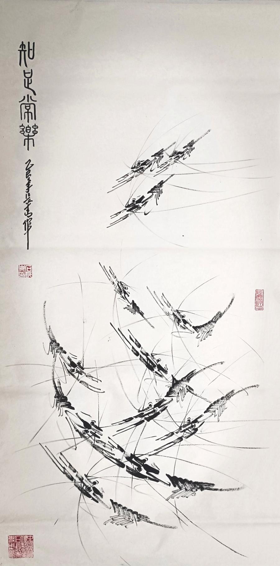 每一幅焦墨虾画都是石长青心路历程的见证。在创作过程中,他与自己的内心对话,将情感与思想倾注于笔墨之间。当他面对空白画布时,心中涌动着对艺术的敬畏与热爱;当他挥毫泼墨时,仿佛与虾这一生灵融为一体,感受着它们的灵动与活力。