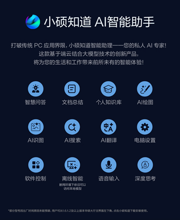 标配32GB LPDDR5X超高频内存以及1TB PCle 4.0高速SSD;拥有全能接口,包括2个USB-A 3.2、全功能雷电4接口、全功能USB-C 3.2、HDMI 2.1 TMDS以及3.5mm音频接口;内置断网可用的“小硕知道”AI智能助手,带来智慧问答、文档总结、AI绘图、AI识图、AI搜索、AI翻译、电脑设置、软件控制等功能,全场景高能高效,智能协助大幅提升办公学习效率。