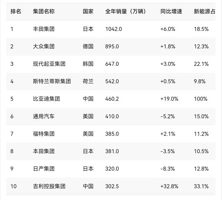 就在这样的喧嚣中,丰田以一种近乎沉默的姿态,交出了一份足以定调格局的成绩单——2025年全球销量达1042万辆,不仅远超老对手大众集团的895万辆,更实现了全球销量六连冠的壮举。