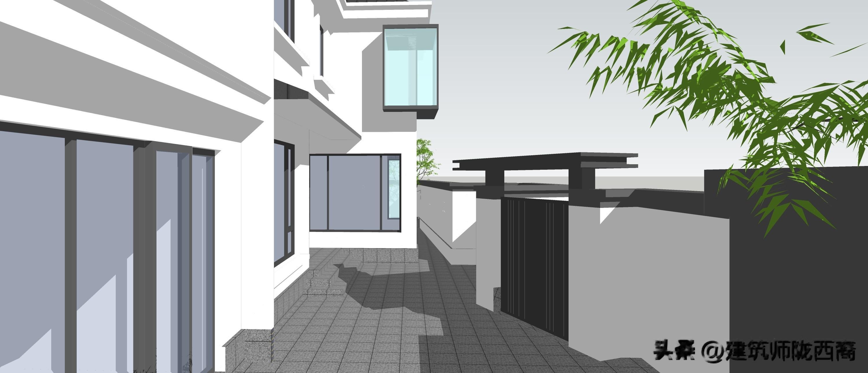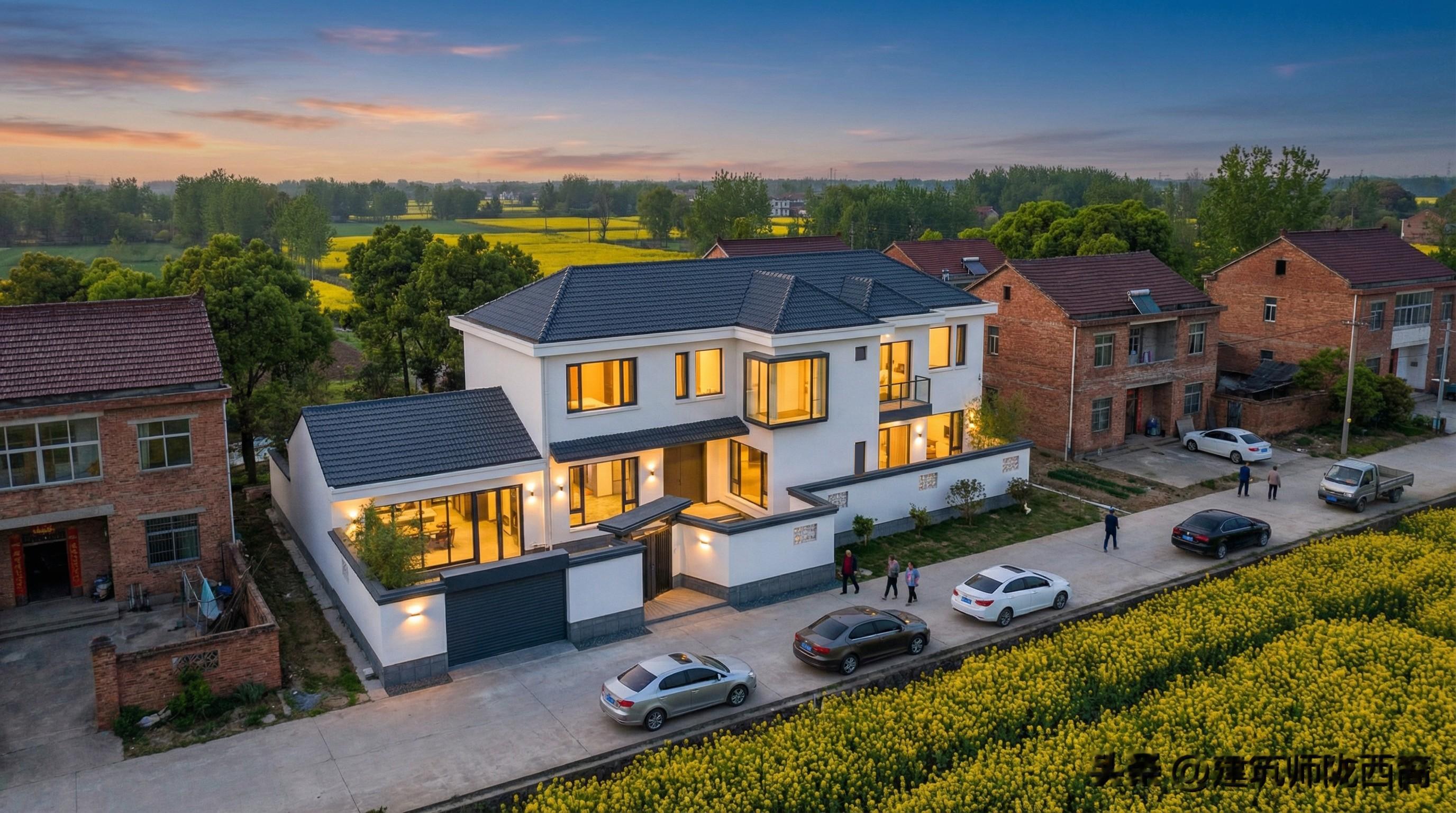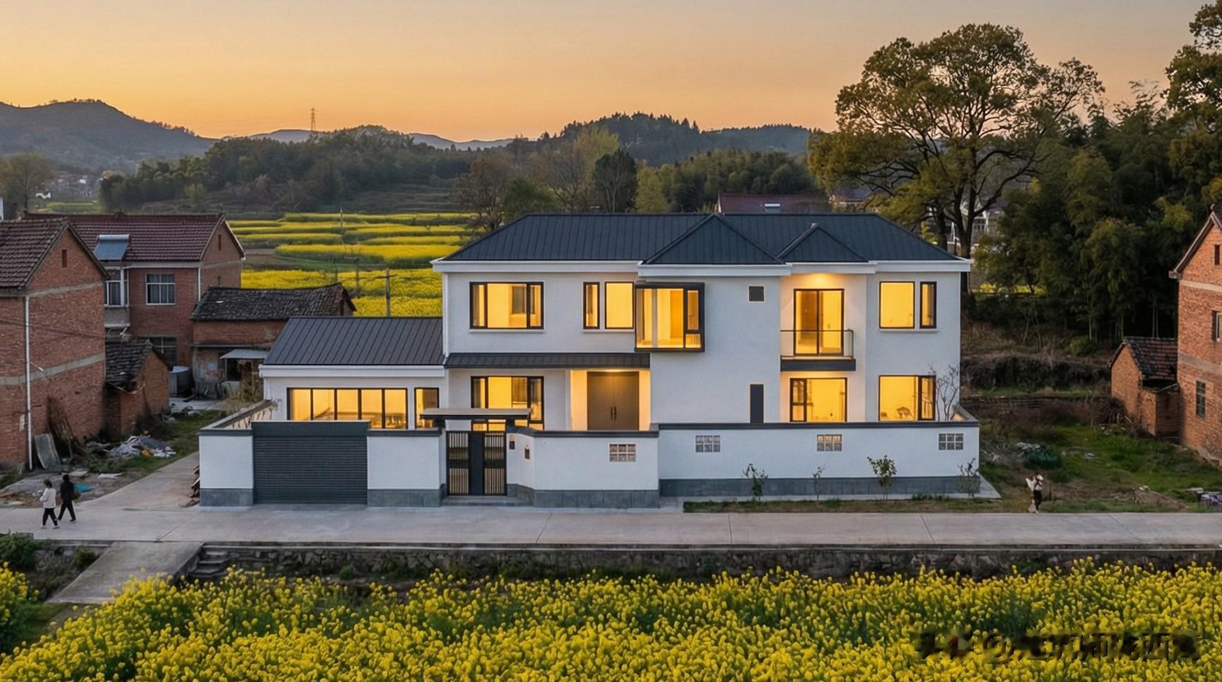 建筑外立面采用现代中式风格,坡屋顶搭配白色外墙漆,再辅以铝合金双层玻璃飘窗,既保留了中式建筑的典雅韵味,又融入现代设计的简洁大气,颜值与实用性兼具,适配农村自建房的审美与居住需求。