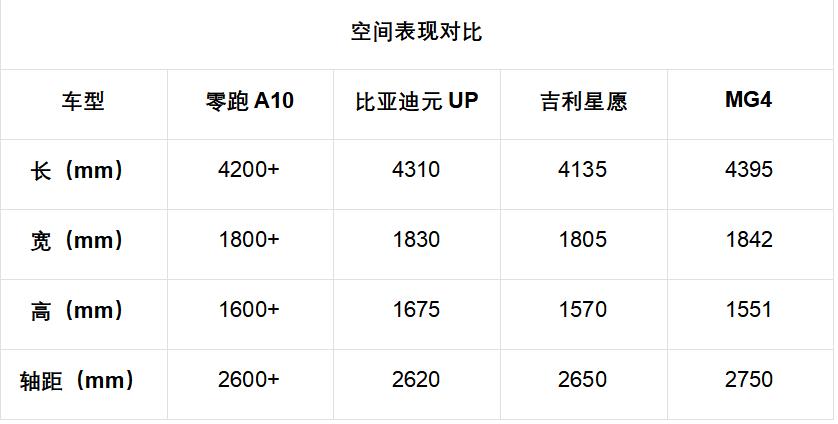 比亚迪元UP的轴距为2620mm,后排空间以及后备厢空间略显局促,满载情况下的舒适性和储物能力稍显欠缺;吉利星愿的轴距为2650mm,车内空间得房率约为82%,但是因为座椅采用了较厚的填充物,车内的空间表现有所缺失;MG4的后备厢开口比较大,储物能力有一定的优势,但是虽然它的轴距有2750mm,但是车内的空间利用率不高,溜背设计还牺牲了后排的头部空间表现。所以,零跑A10的出现,能够打破“小型车空间小”的固有认知。