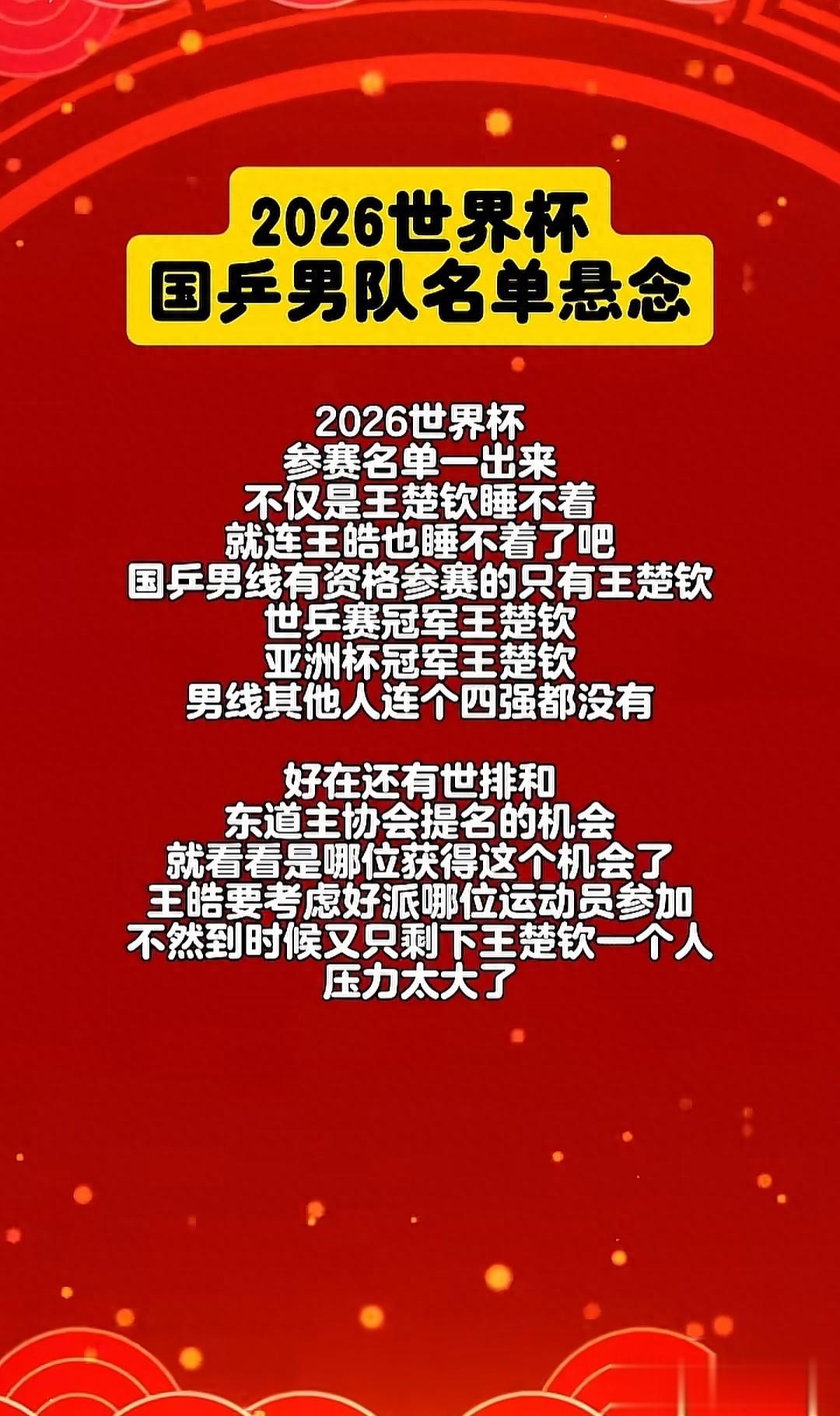 2026世界杯参赛名单一出来,不仅王楚钦紧张,连王皓都睡不着了。