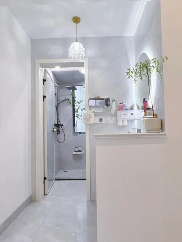 浅灰瓷砖通铺搭配同色美缝剂,地面浑然一体显大又耐脏。