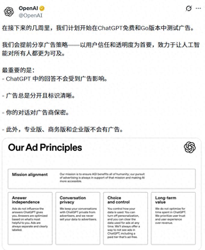 1 月 17 日,OpenAI 官方宣布:未来数周内,公司将在面向美国地区的部分用户在 ChatGPT 中正式投放广告。
