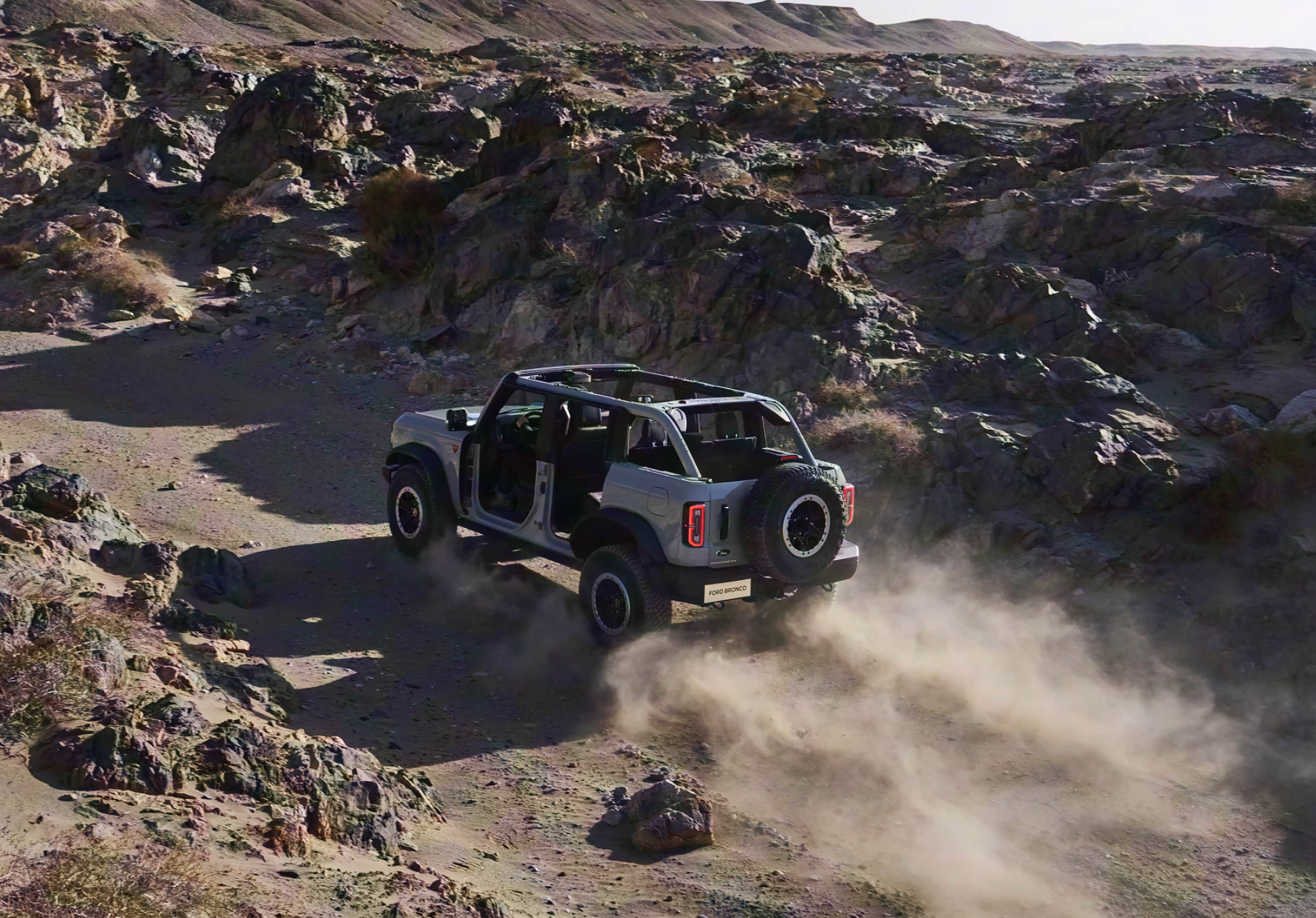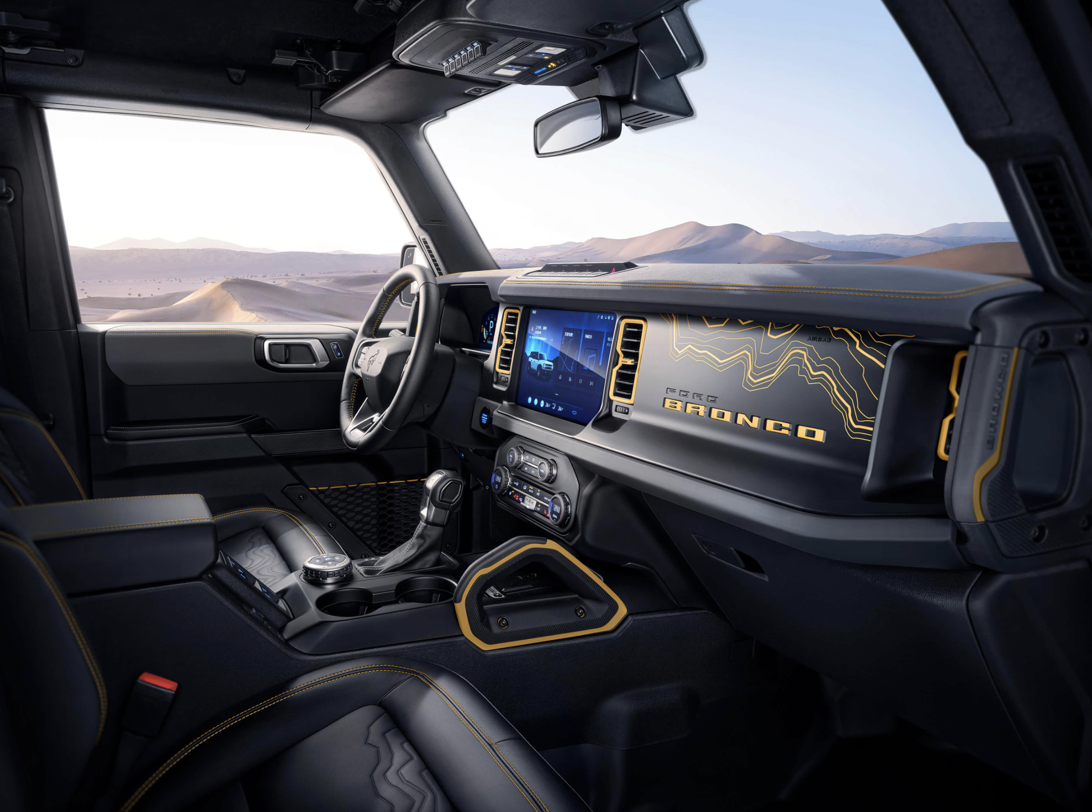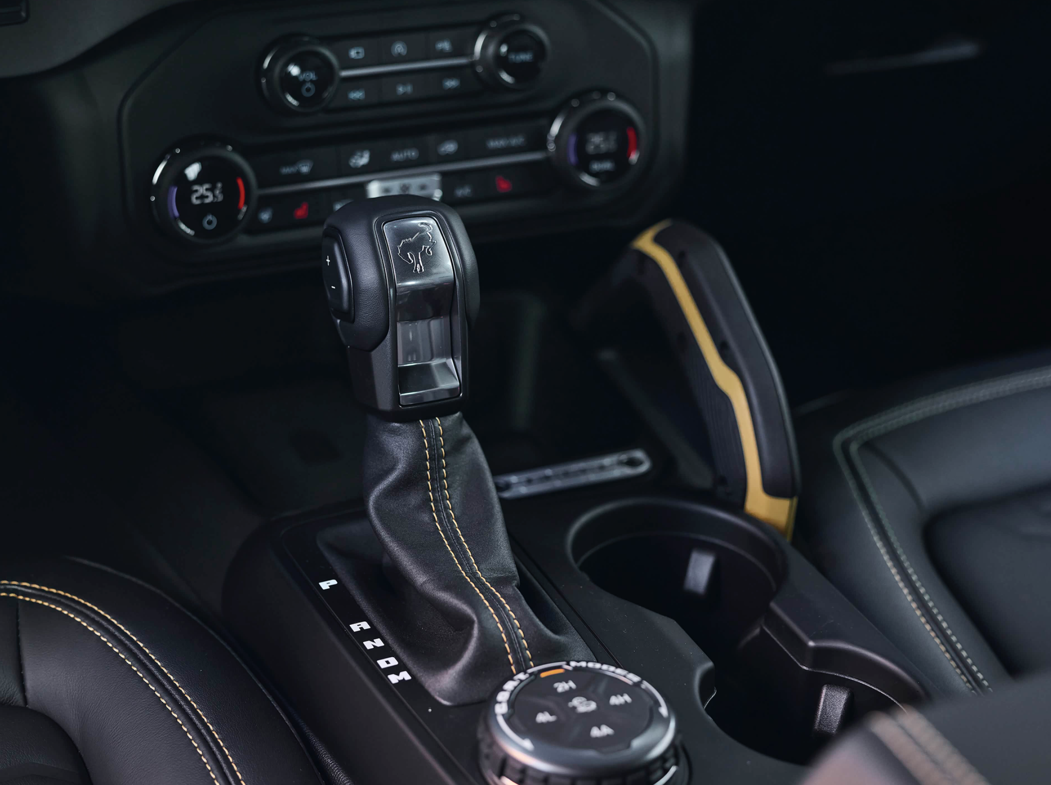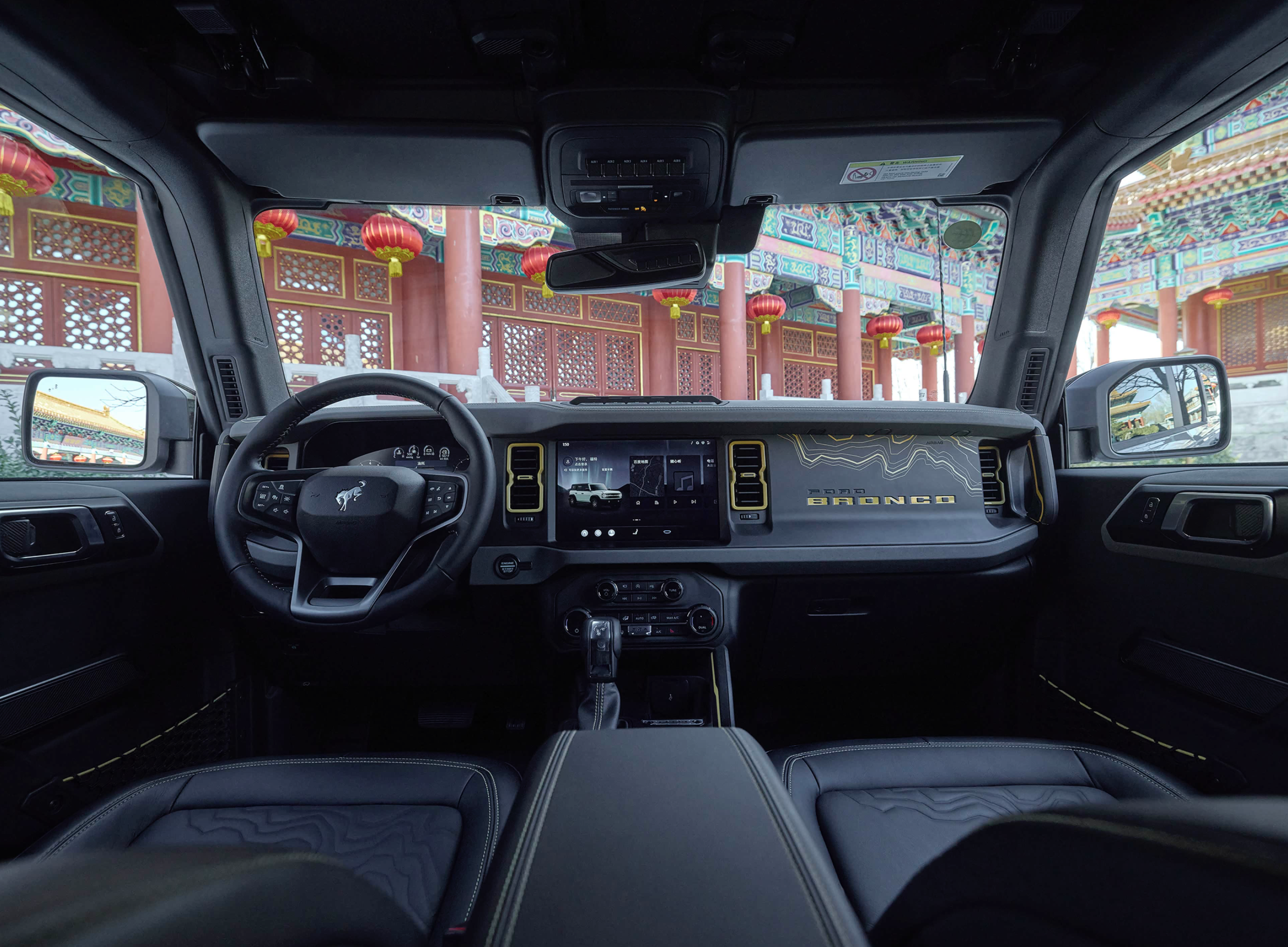 核心部分,全新福特烈马BRONCO动力搭载了2.3T涡轮增压四缸发动机,最大功率275马力,峰值扭矩429牛·米。传动系统则配备了10挡手自一体变速箱。悬架采用了双叉臂式独立悬架、多连杆式独立悬架的组合,并采用了福特汽车G.O.A.T全地形管理系统,标配540°越野透明底盘,FOX 2.5''内路旁通氮减,提供原厂35英寸大脚车轮和原厂可断开防倾杆。还拥有7大驾驶模式,支持透明底盘联动。配备的DANA前后轴电控机械差速锁,支持3.06倍扭矩放大+4.7主减速比。