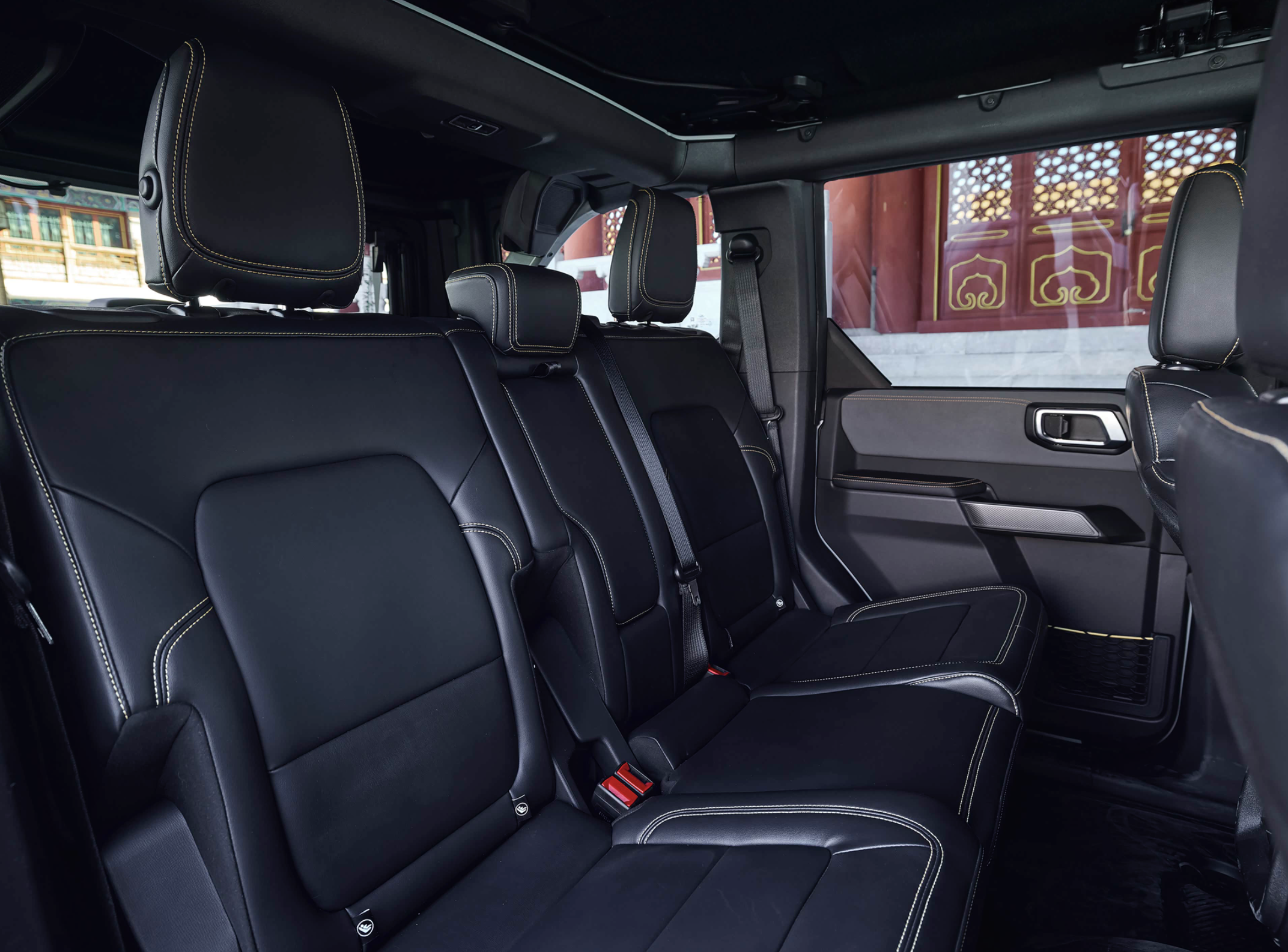 来到车身侧面,福特烈马BRONCO采用了经典的方盒子轮廓设计,黑色的中柱(A/B/C/D柱)和黑色的车顶整合在一起,车辆还将原厂提供20余处可拆卸模块,10余处原创预留孔位以及车内预留顶置式拓展开关,能满足年轻消费者无限的可能性。配备了17英寸的铝合金轮圈搭配着315/70 R17的轮胎,再加上外露的铆钉、笔挺的腰线和硬派的轮眉,增添了更多的硬派气息。车身尺寸方面,车辆长宽高分别为4800(4825)/1990(2070)/1835(1840、1900)mm,轴距为2950mm。
