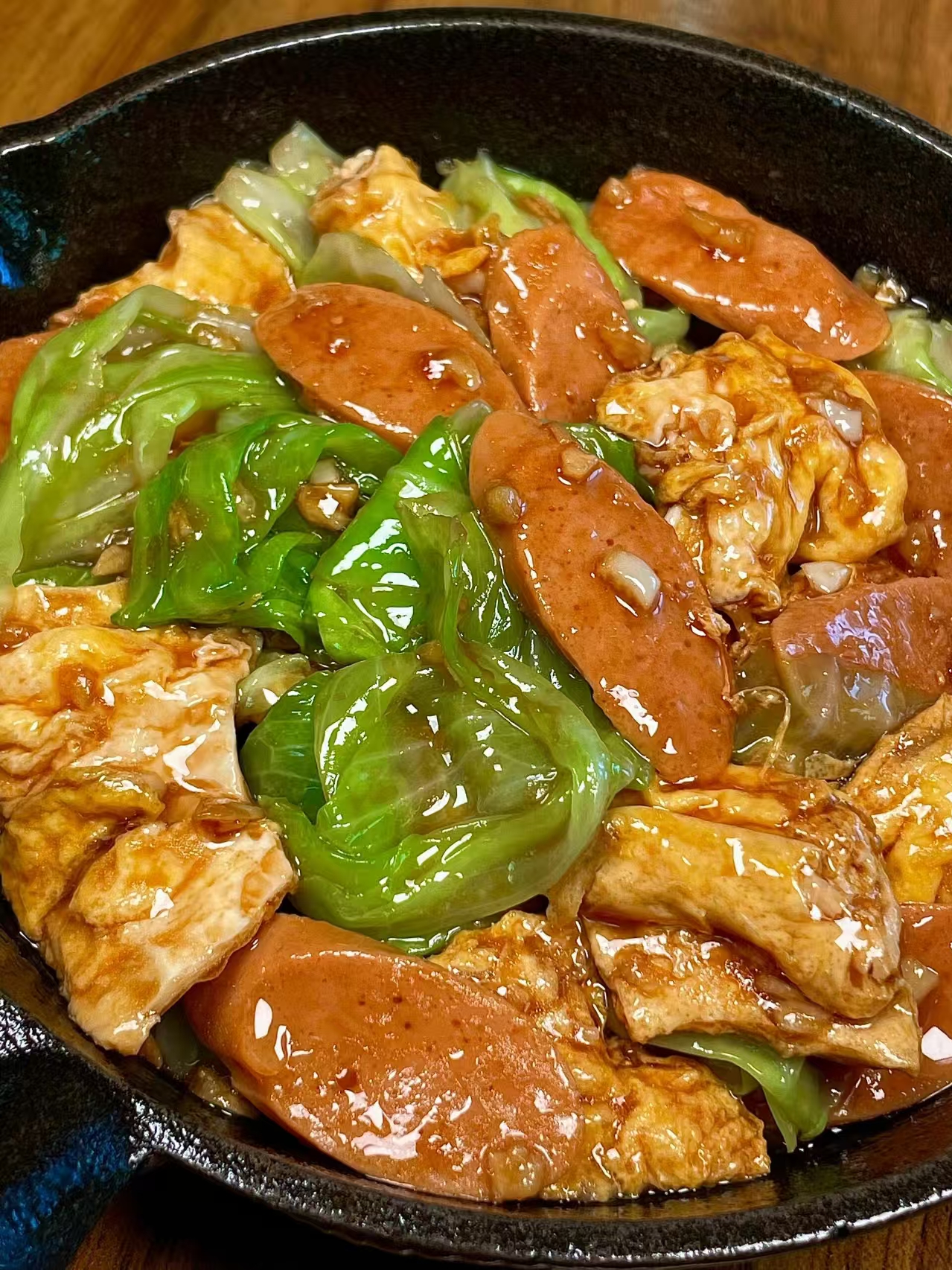 包菜 1 小半棵(手撕块)、鸡蛋 3 个、火腿肠 2 根(切片)、大蒜 3 瓣(切末)、生抽 1 勺、蚝油半勺、小米辣 2 个(切圈,可选)、食用油适量
