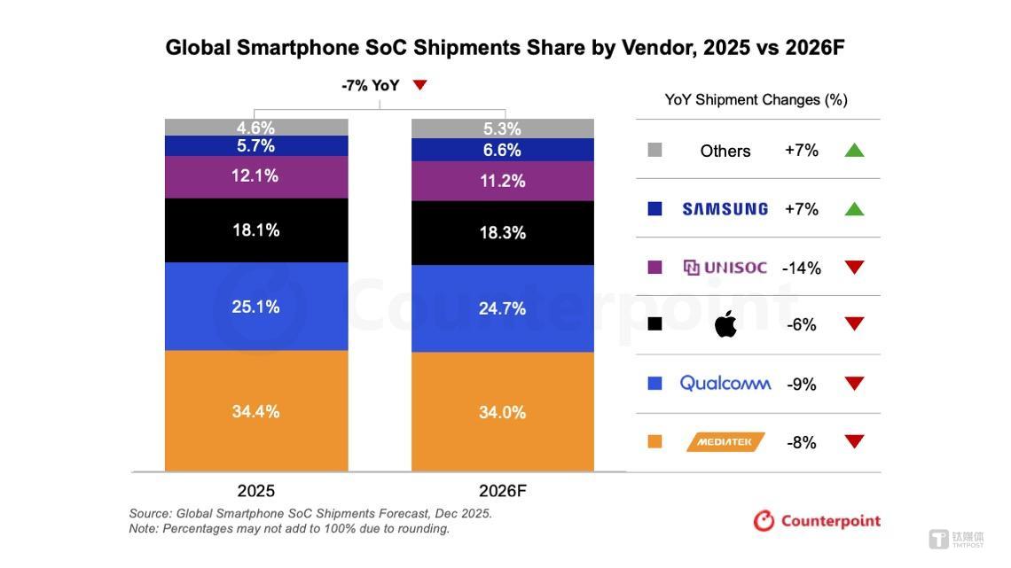根据市场研究机构Counterpoint Research给出的预测数据,2026年全球智能手机出货量将同比下降6.1%,而智能手机SoC出货量预计较2025年同比下降7%。其中,联发科出货量预计同比下滑8%,高通出货量预计将同比下滑9%,苹果出货量同比下滑6%,紫光展锐预计2026年出货量同比下滑14%。
