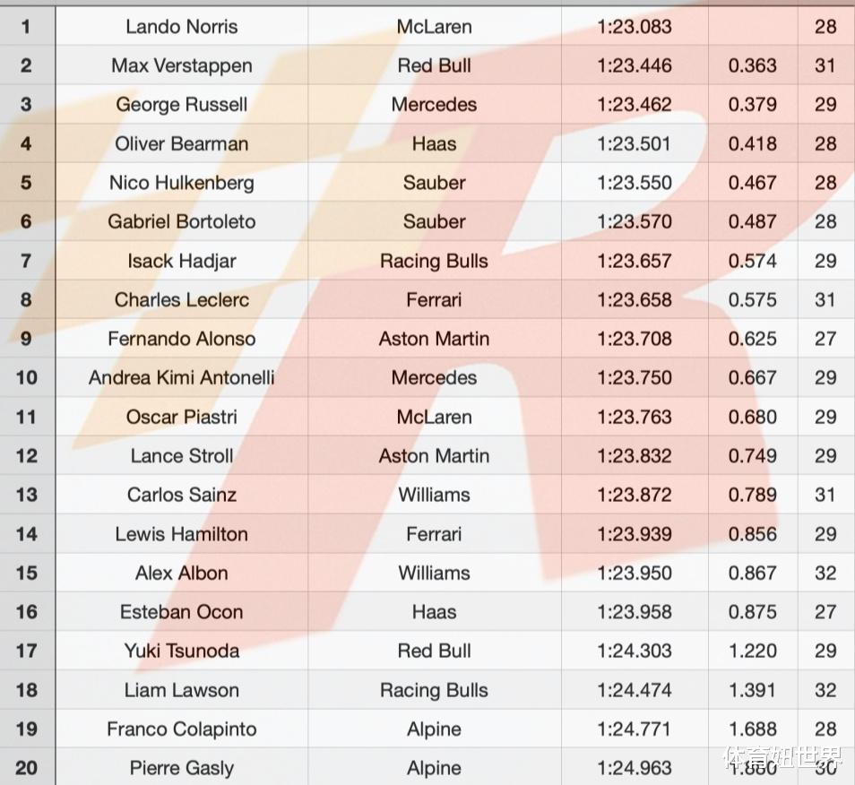 而梅奔车队的拉塞尔紧追在现任世界冠军后面0.016秒名列第三,缺席了第一段自由练习的皮亚斯特里终场则仅仅排在第11位。