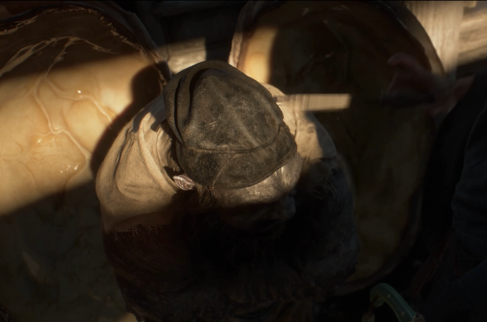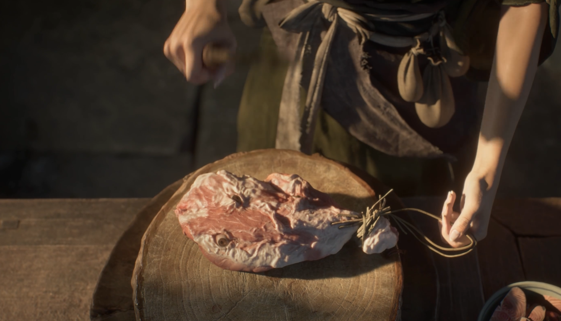 除了以上的细节,小板凳还发现了一个细节,就是女主人在切肉的时候,肉的上面长出了一双眼睛。虽然画面一晃而过,但却意味深长。什么样的肉会长眼睛?妖怪。而能够拿妖怪的肉做饭的人,想必不是什么普通角色,可见这位出场的女主,在游戏中的身份不简单。