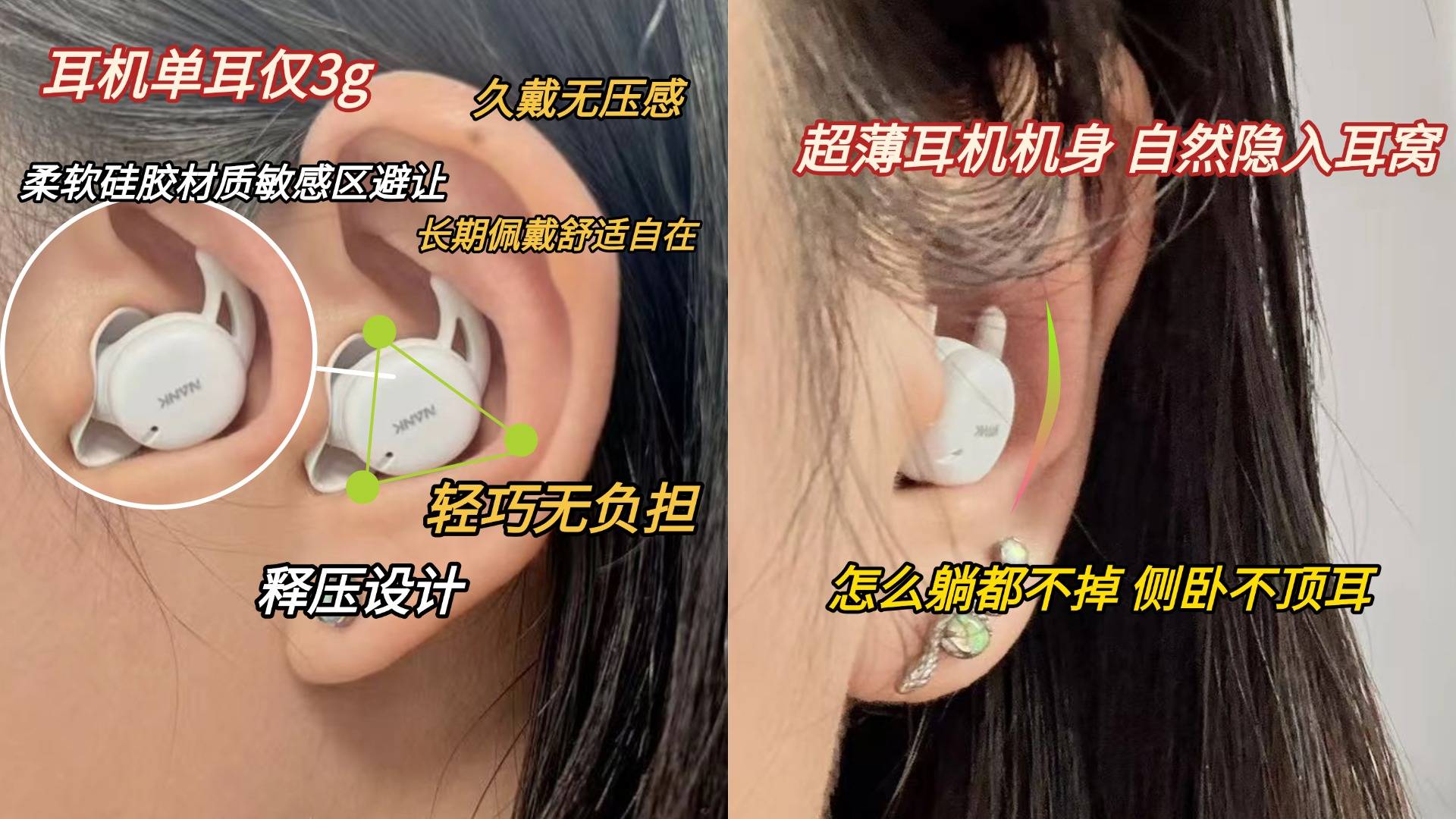 南卡DeepSleep堪称睡眠耳机界舒适标杆!首创4mm超薄睡眠声学模组,搭配3g轻量机身,佩戴几乎无感。出音嘴缩短2%隐入耳窝,ZPP三点力学结构与NanoSoft舒肤涂层均匀分散耳压、触感顺滑。侧睡、趴睡、躺睡全姿势适配,不压耳不顶枕,隐形贴合耳道不胀痛,实现“戴着比没戴还轻松”的体验。