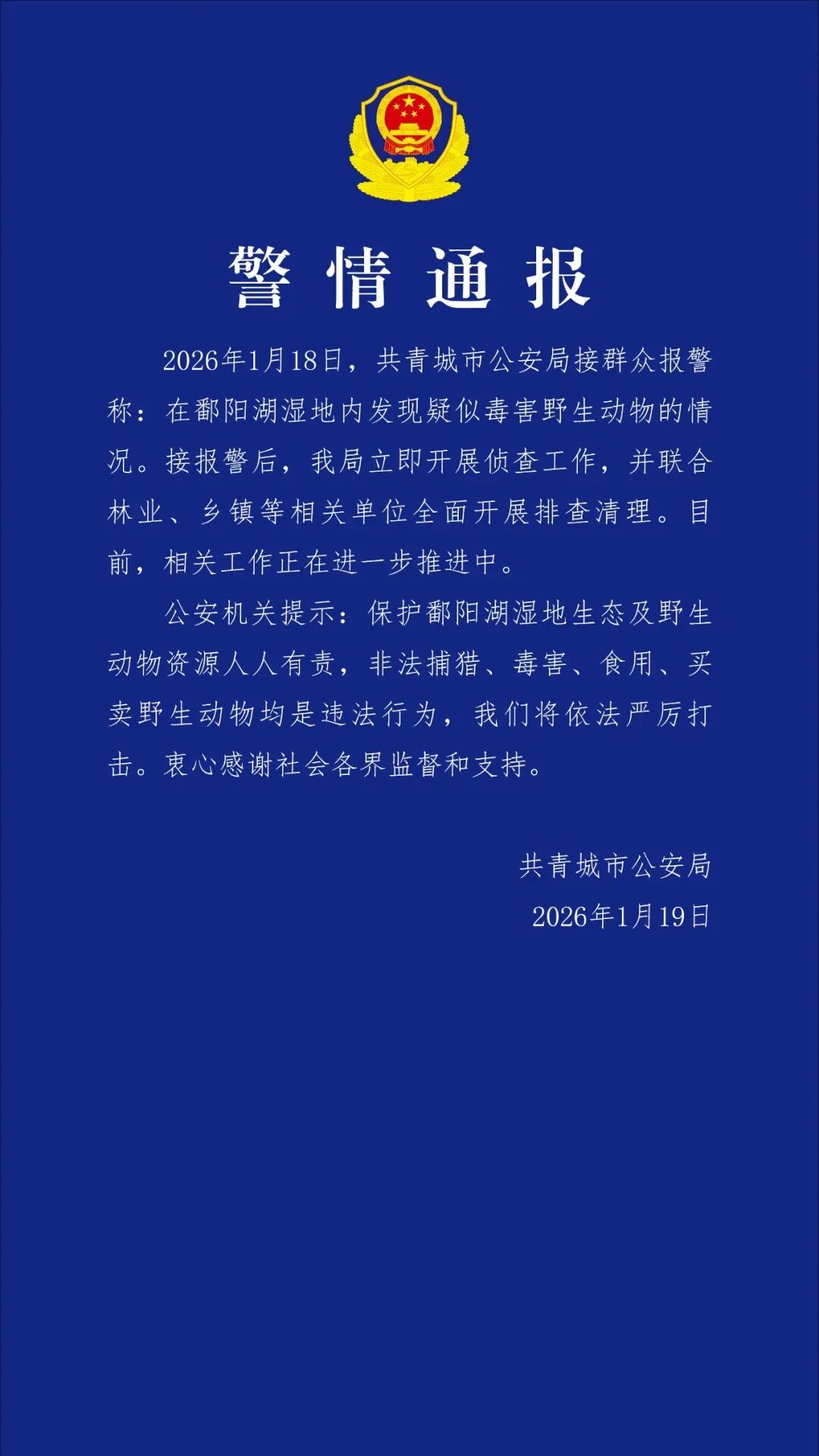 2026年1月18日,共青城市公安局接群众报警称:在鄱阳湖湿地内发现疑似毒害野生动物的情况。接报警后,我局立即开展侦查工作,并联合林业、乡镇等相关单位全面开展排查清理。目前,相关工作正在进一步推进中。