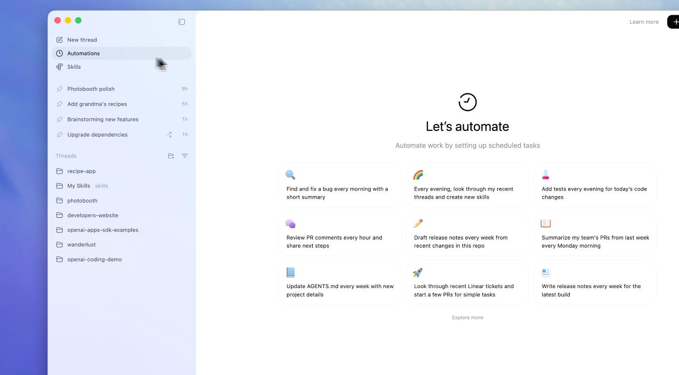 三、使用自动化委托重复性工作,两种风格可选使用Codex应用,开发者还可以设置自动化任务,让Codex在自动计划下后台运行。自动化任务将指令与可选技能相结合,按照开发者定义的计划执行。当自动化任务完成后,结果会进入审核队列,以便开发者在需要时可以重新介入并继续工作。