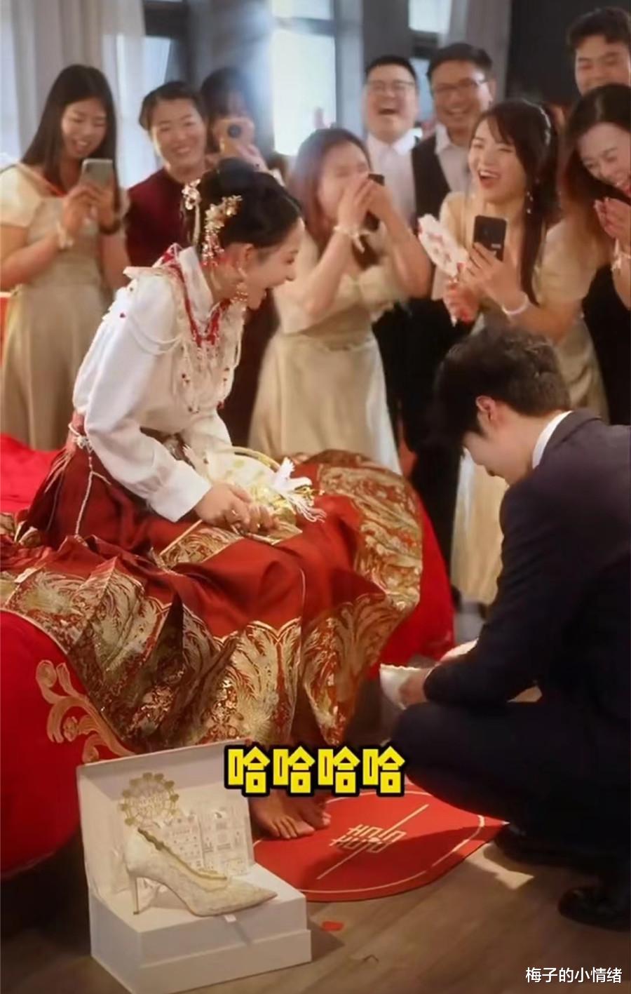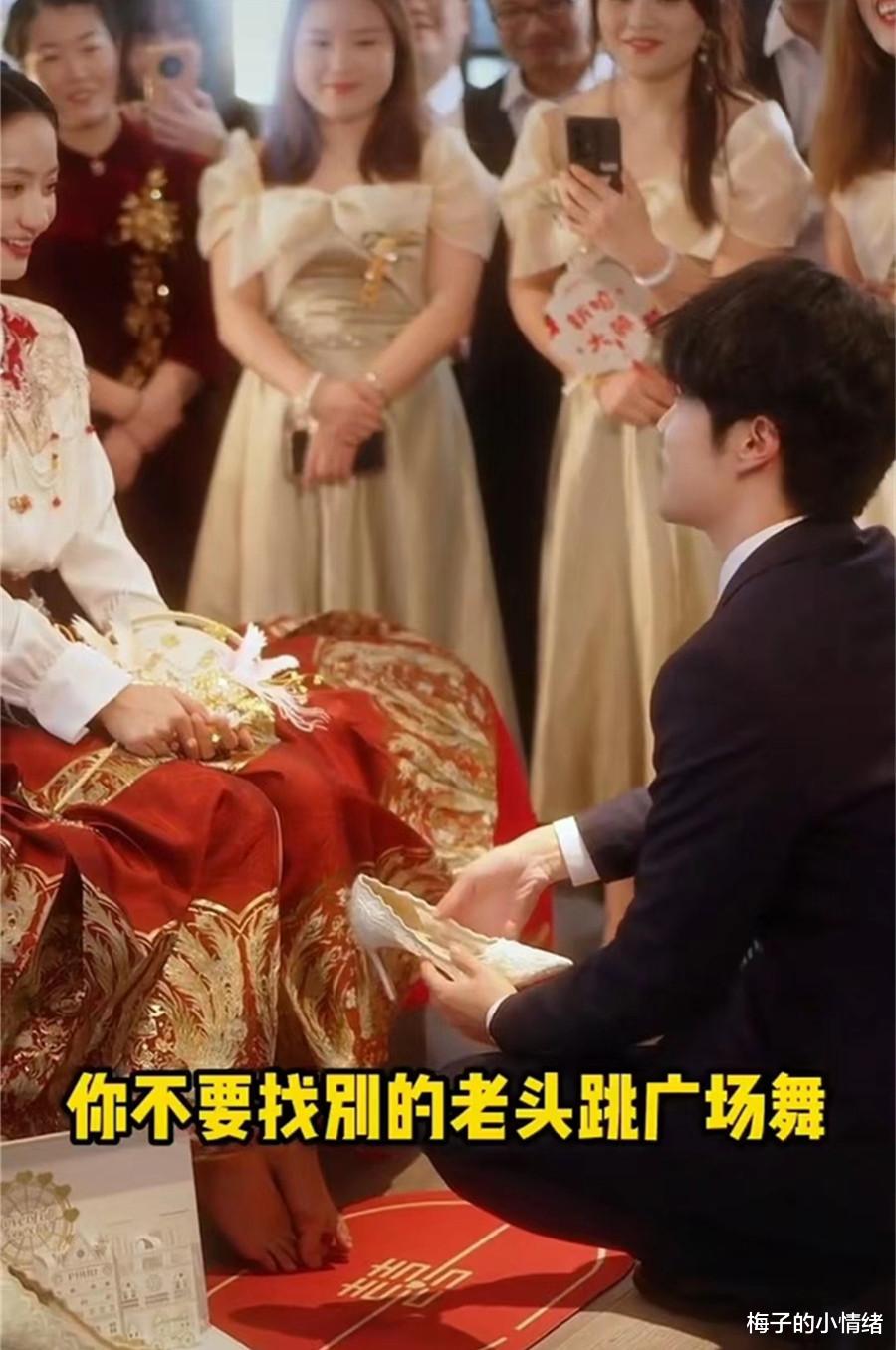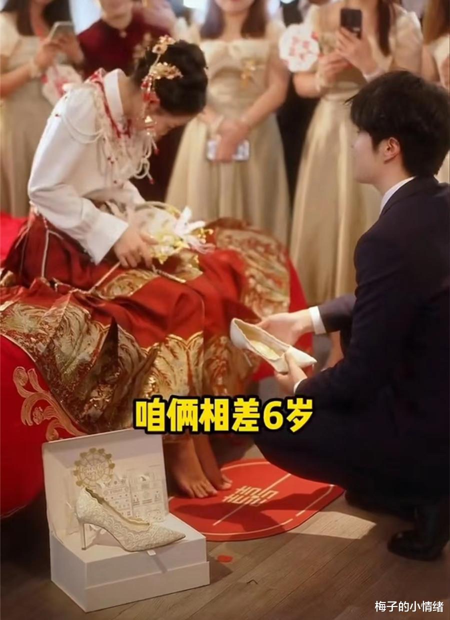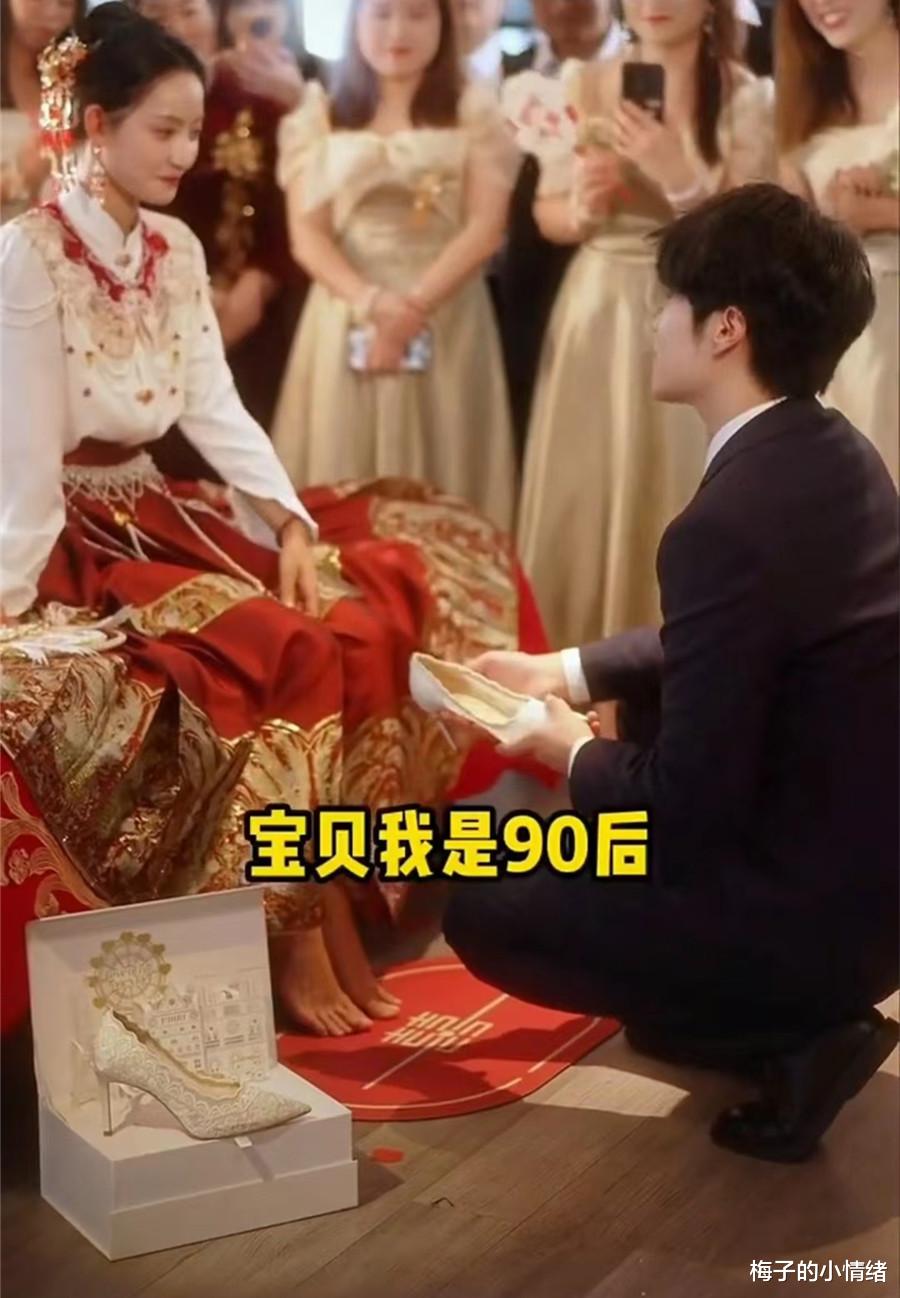 在亲友的见证下,新郎按照迎亲流程安排,要亲手给新娘穿上高跟鞋,看到眼前美丽的妻子,新郎眼里全是藏不住的欣喜和满意,给新娘穿鞋之前,新郎深情表白:“宝贝,我是90后,你是00后。”