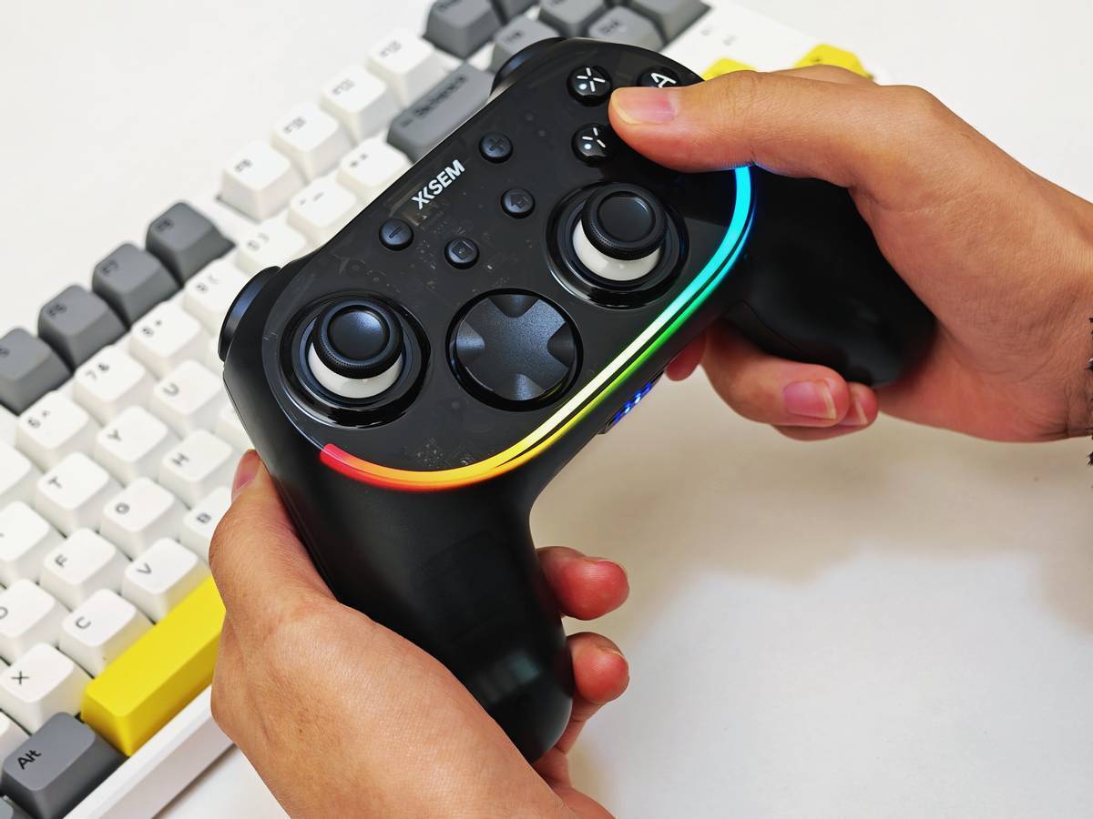 在配置表现上,西圣GC1同样强悍,搭载电竞级极速连接引擎,1000Hz回报率与智能抗干扰算法将输入延迟降至0.5ms,支持2.4G、蓝牙和Type-C三模连接,兼容Switch、PC、手机等主流设备,实现“所想即所控”。原生六轴体感传感器可捕捉旋转、倾斜和挥动等动作,1ms级低延迟与1:1映射带来沉浸式操控体验。手柄设计轻量化(214g)、握角科学(15°)、NanoSkin亲肤防滑涂层贴合手型,握持舒适稳固。半透明幻雾晶透机身结合RGB灯效和10种炫酷模式,科技感十足,同时兼具耐磨与防指纹性能,让手柄不仅手感极佳,也十分赏心悦目。