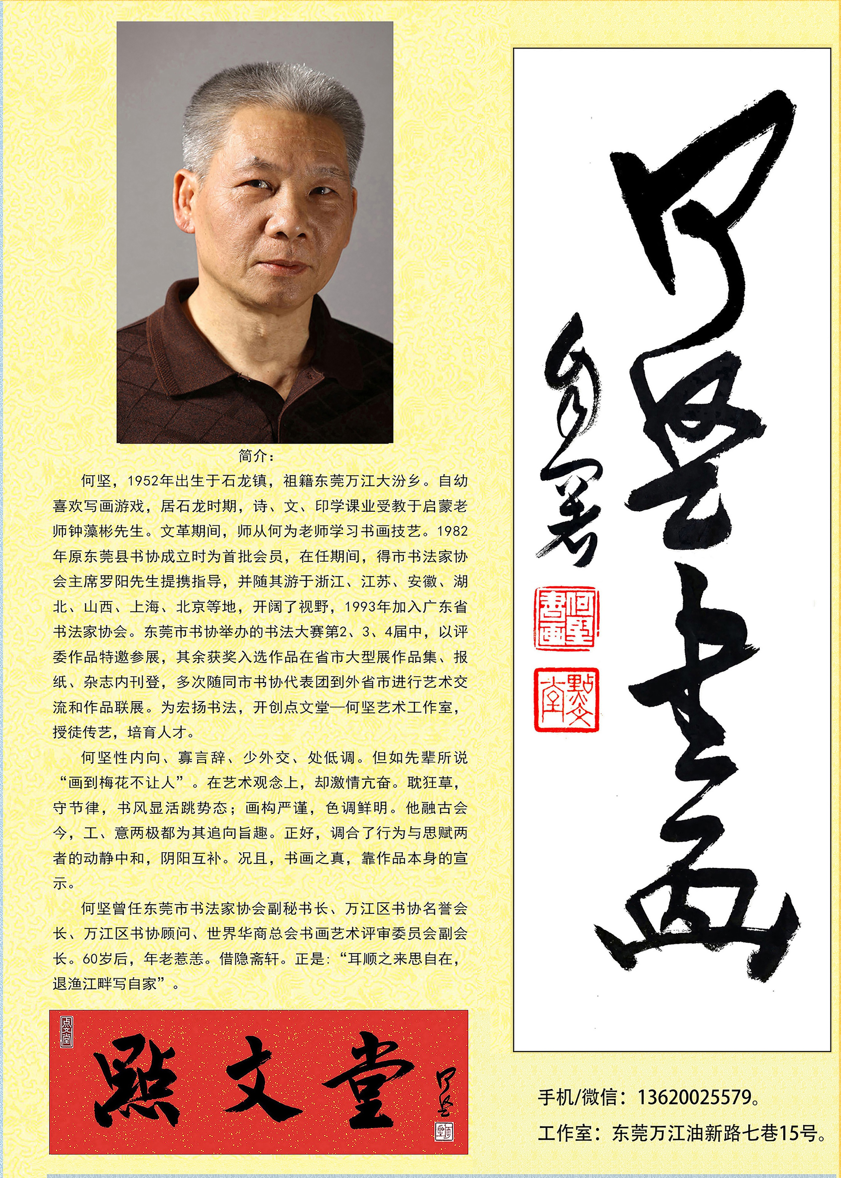 何坚,1952年出生于广东省东莞市石龙镇,祖籍万江大汾乡。自幼喜爱书画。居石龙时期,诗、文、印学课业受教于启蒙老师钟藻彬先生,后又师从何为老师学习书画技艺。1982年何坚加入东莞市书法家协会,承蒙罗阳先生提携与指导,视野得以极大开阔。1993年加入广东省书法家协会。其作品曾多次参展,并获得观者的一致好评。