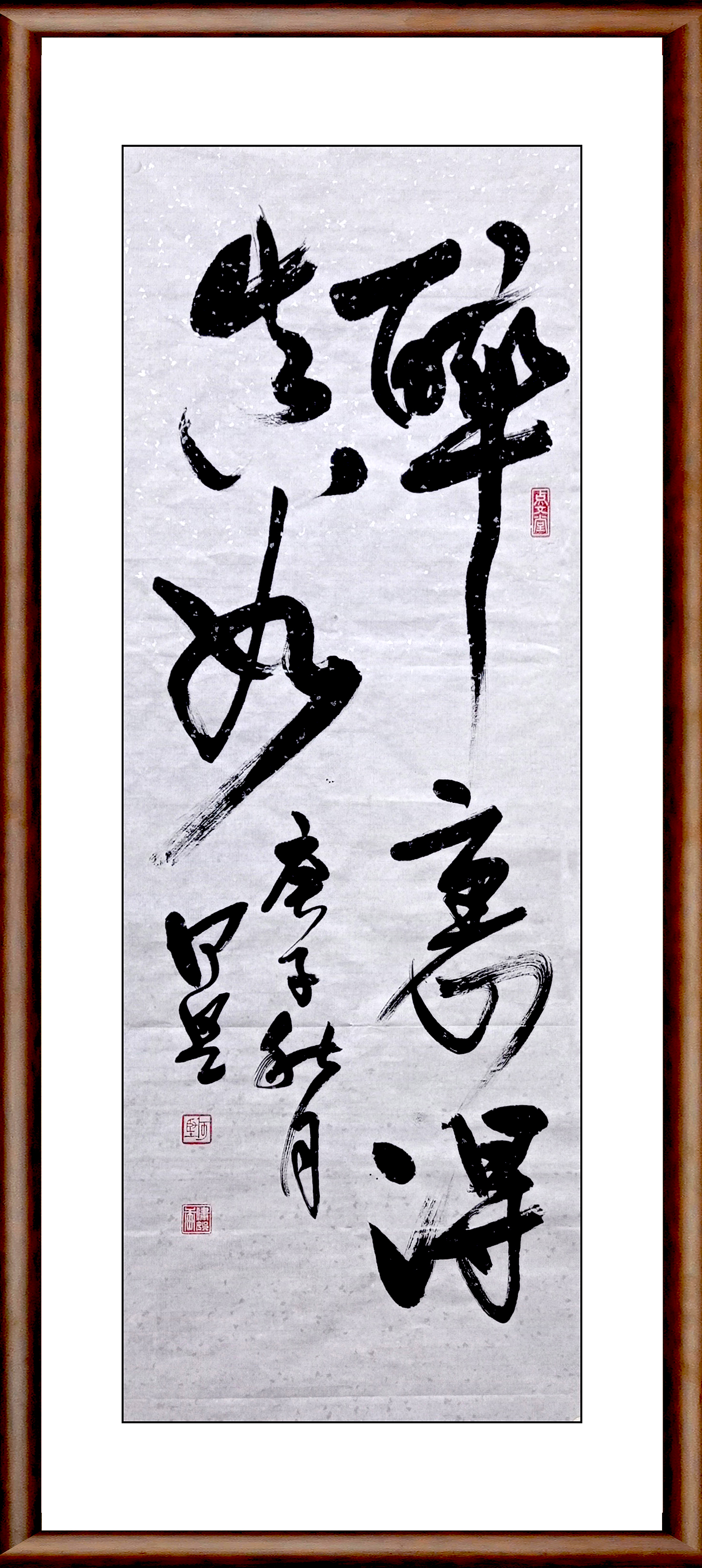 何坚性内向、寡言辞、少外交、处低调。但如先辈所说:“画到梅花不让人"。在艺术观念上却激情亢奋。耽狂草守节律,书风显活跳势态;画构严谨,色调鲜明。他融古汇今,工意两极都追向旨趣。正好调合了行为与思赋两者的动静中和,阴阳互补。