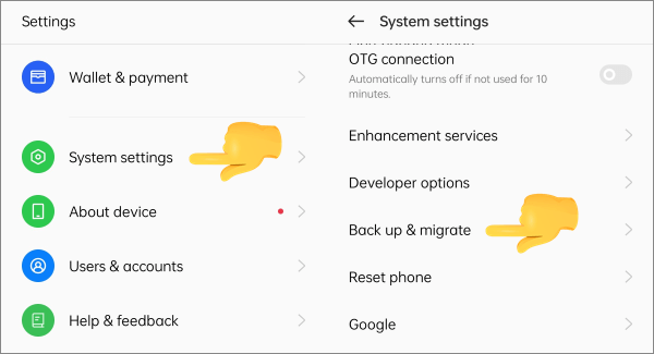 步骤1.单击手机上的“设置” ,然后选择“系统设置” > “备份和迁移” 。