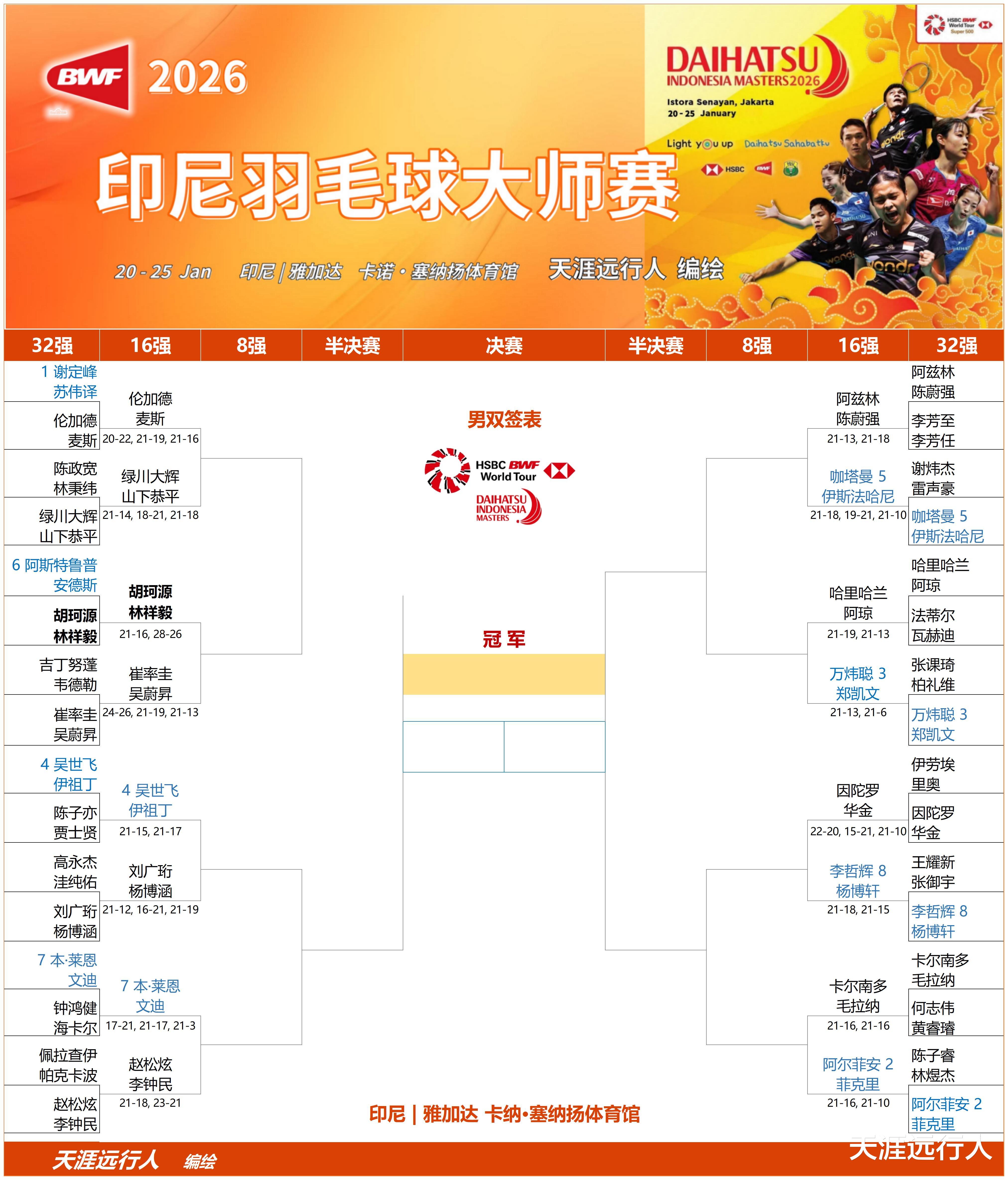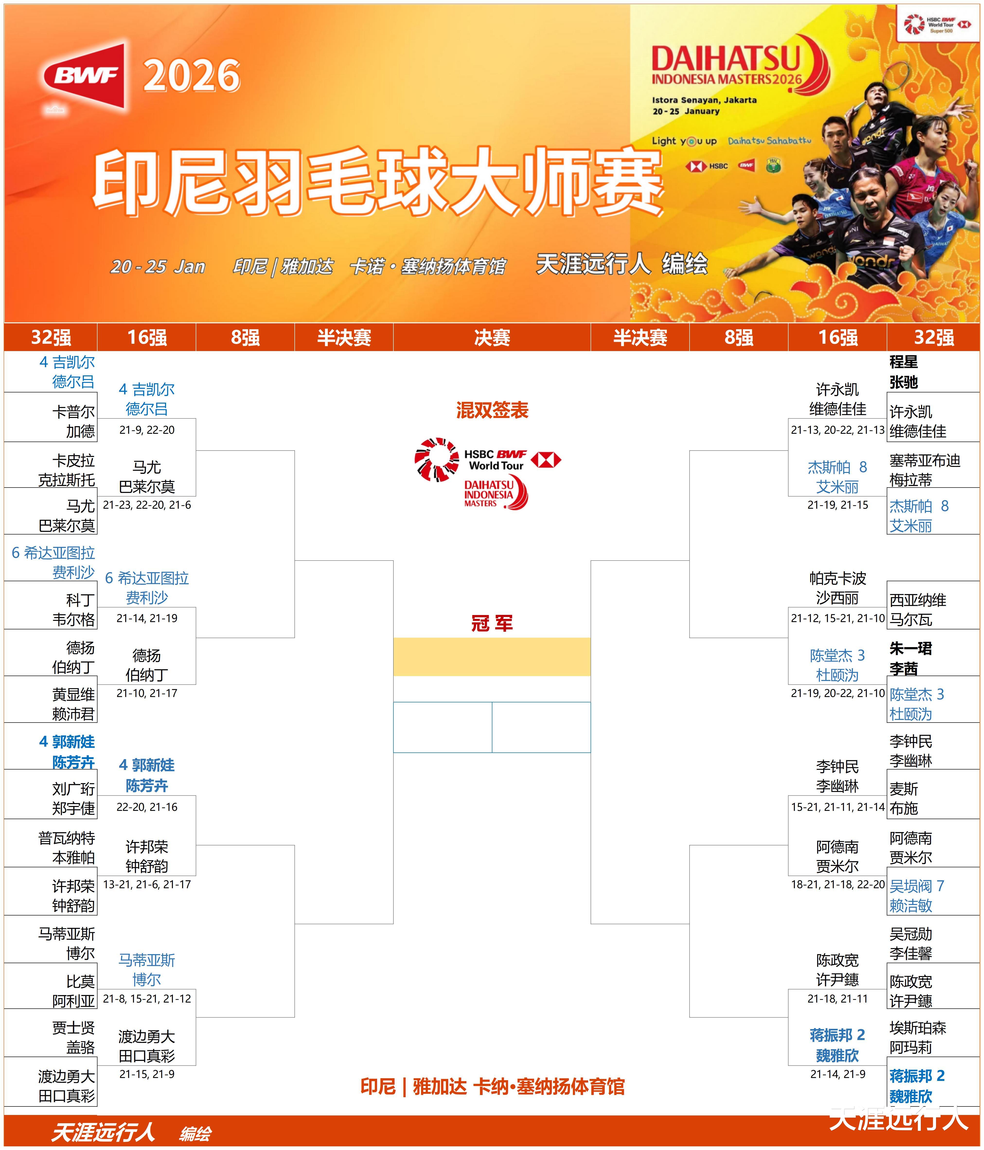 北京时间1月21日23时26分,2026世界羽联超级500印尼大师赛第二比赛日,男女单打以及混双32进16轮次的47场(男单格姆克退赛),和男双首轮的最后一场日本绿川大辉/山下恭平对战中国台北陈政宽/林秉纬的比赛,共48场角逐,全部决出了胜负,赛会16强,悉数产生,1/8决赛对阵出炉。