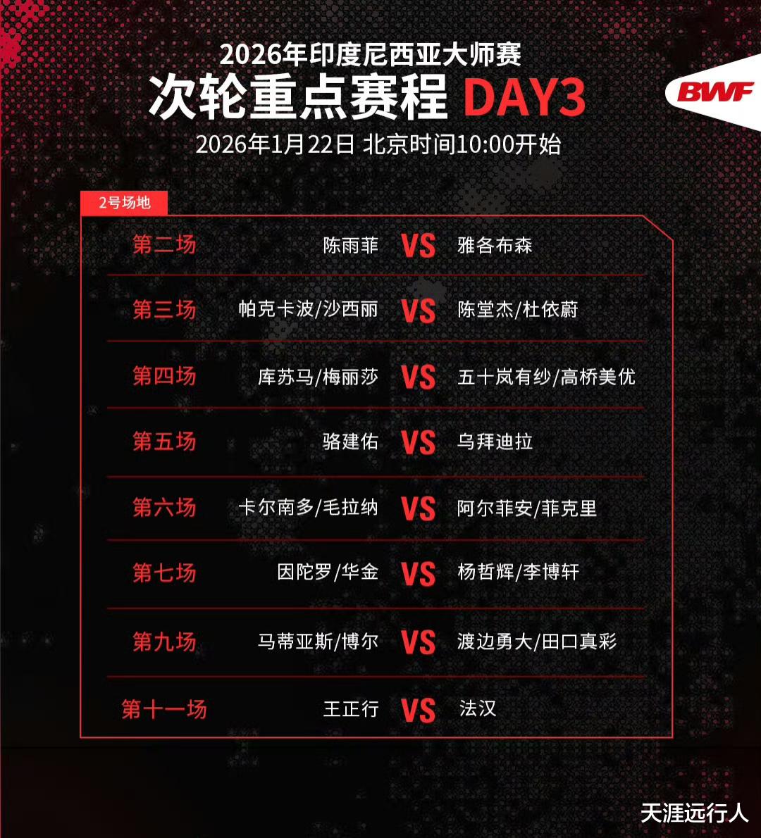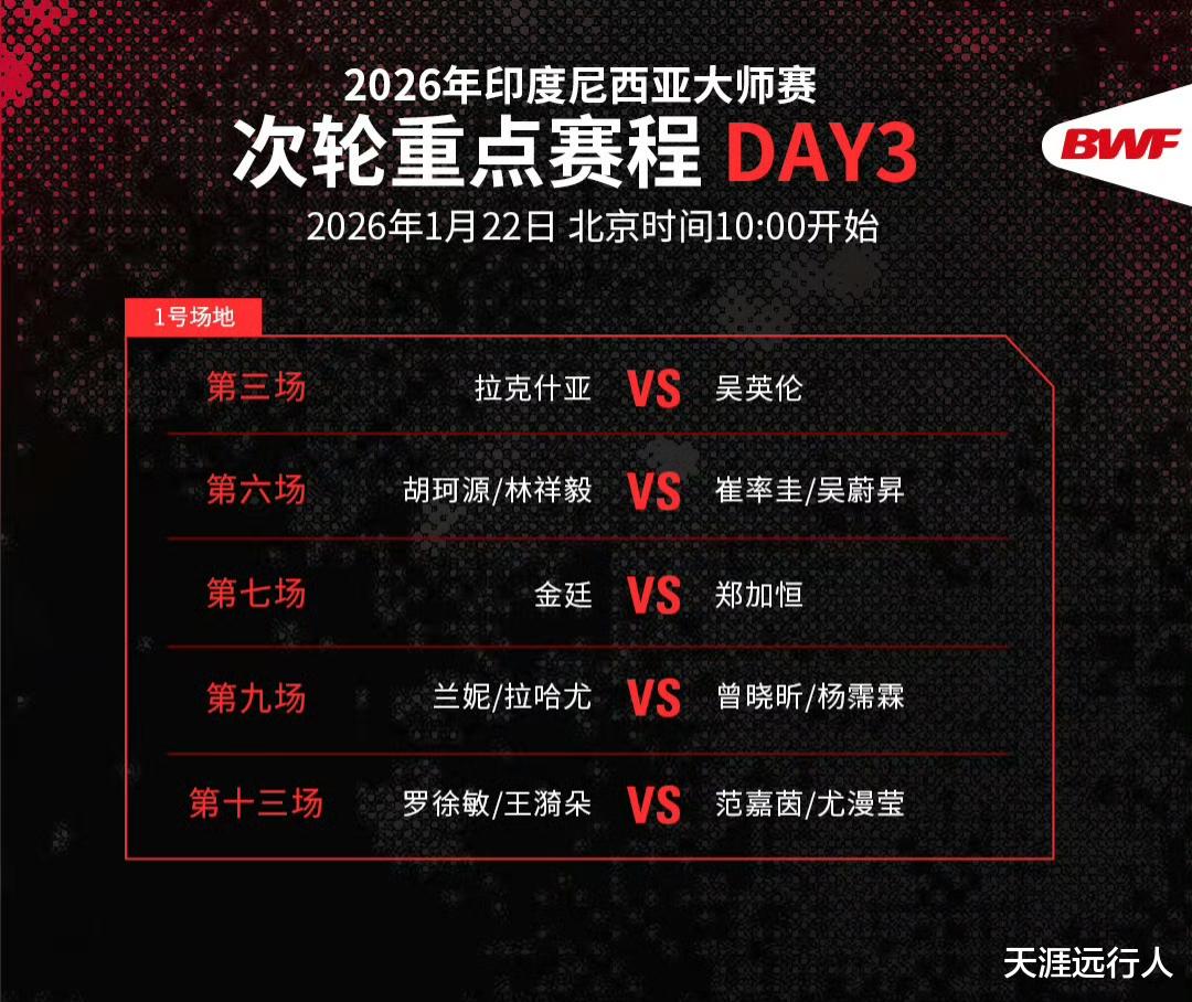 北京时间1月21日23时26分,2026世界羽联超级500印尼大师赛第二比赛日,男女单打以及混双32进16轮次的47场(