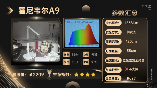 核心光源方面,霍尼韦尔A9采用的也是全光谱照明方案,从光谱上看蓝光整体控制的也相对比较好,没有明显高峰,符合RG0无蓝光危害标准,同时各个波段的过渡也比较顺畅,光线舒适度比较均衡。在光线方面采用侧发光设计,光线亮度适中,同时搭载智能调光的功能,可保持光线稳定舒适。光效上支持3000K暖黄光与4000K中性白光两档切换,能适配学习、阅读等不同场景,操作逻辑简单易上手。